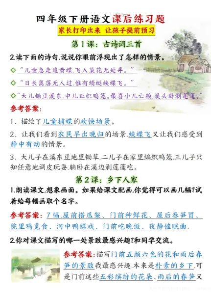 四年级(下)语文 课后练习题专项,PDF电子版,可打印,免费下载