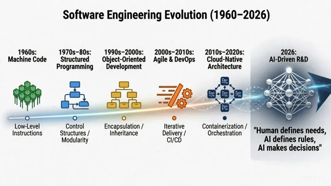 回顾软件工程六十余年的发展历程,从机器语言编码、结构化程序设计,到面向对象开发、敏捷与DevOps落地,再到云原生架构普及,行业演进的核心逻辑始终清晰:技术工具不断替代重复性劳动,推动研发人员向更高价值环节迁移。编译器解放了手工汇编,IDE简化了编码调试,自动化测试替代了手工校验,而人工智能的到来,正掀起一场更为彻底的变革——AI不再只是辅助工具,而是具备独立决策能力的核心生产力,人与AI的协作模式,正在迎来颠覆性重构。