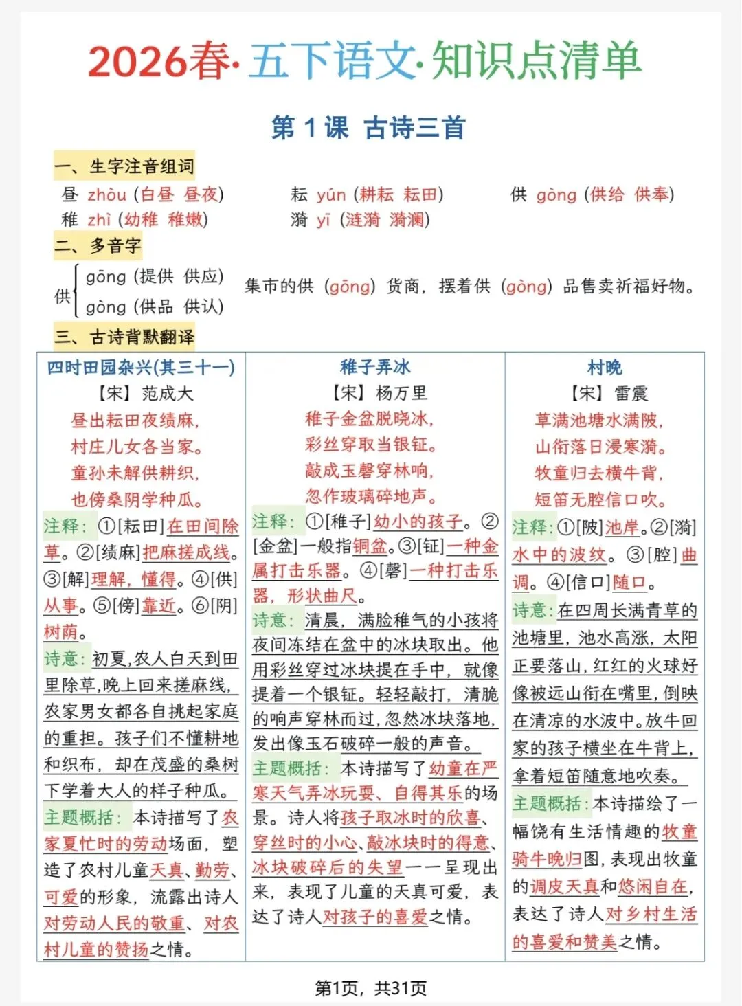 【五下语文】五年级下册语文知识点清单|可下载打印