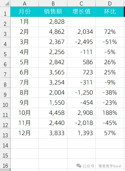 C列为增长值,公式很简单,C3=B3-B2,下拉复制即可,求得月份数据增长;