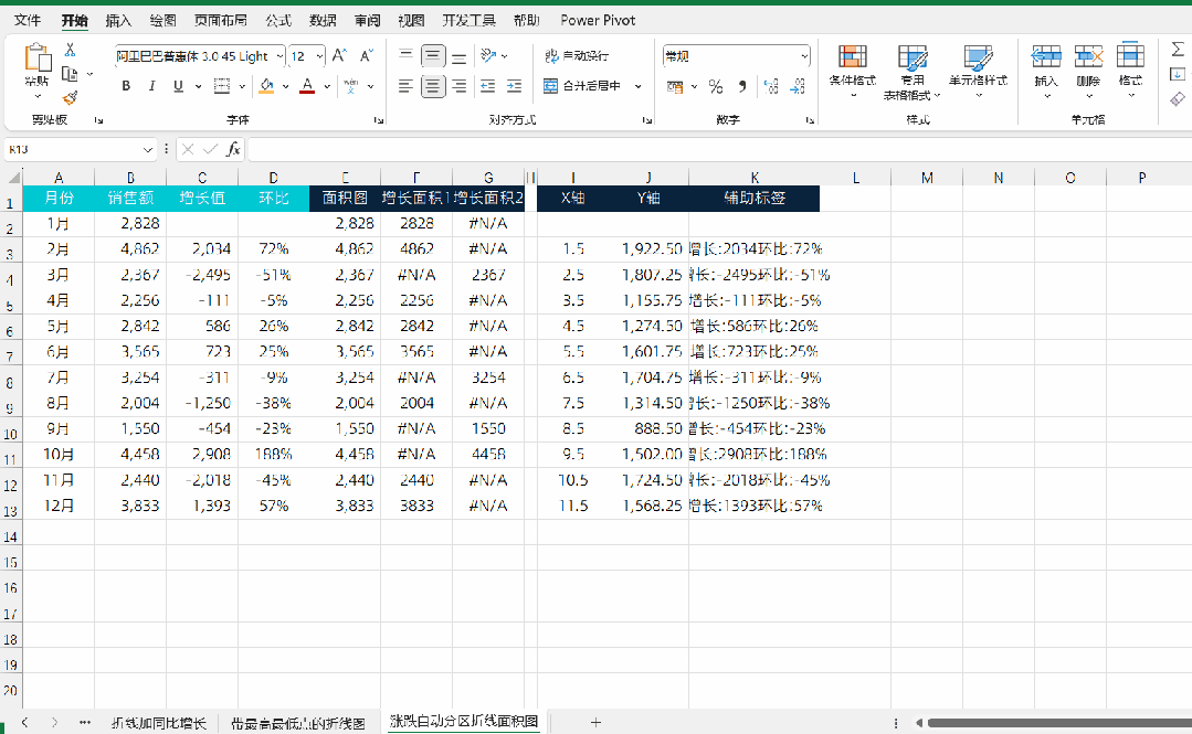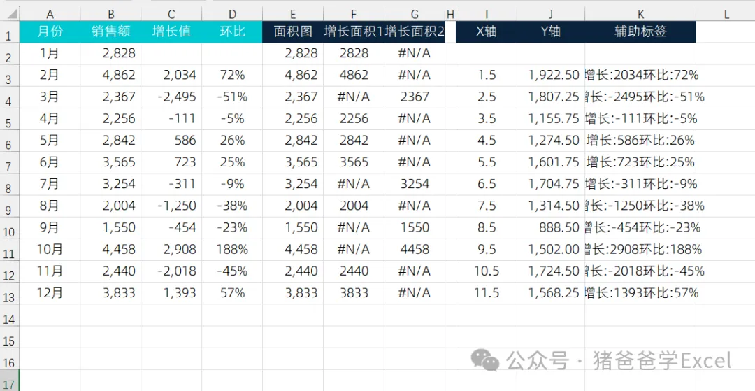 K列就是要展示的其他数据,这里包括了增长值和环比,
