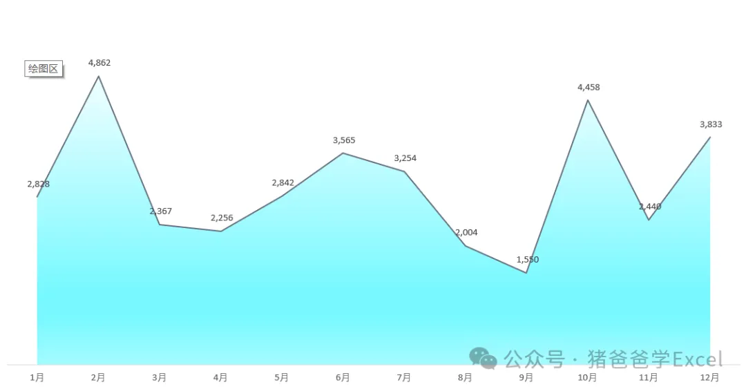 这一步完成,其实你的折线图,就已经比80%的小伙伴优秀了,再添加数据标签,将面积图填充设置成【渐变填充】,那么,你就已经比90%的小伙伴优秀了。简单效果如下: