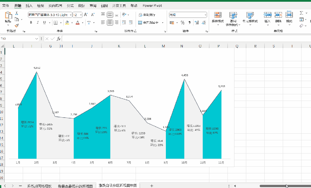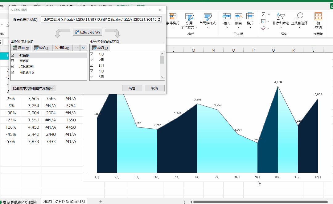 F列为增长面积1,F2=IF(ISEVEN(COUNTIF($C$2:C2,”<0″)),B2,NA()),公式下拉复制;注意公式中$C$2:C2的引用方式,从而逐步计算到对应单元格的时候,增长值为负数,也就是下跌的次数,再通过ISEVEN判断下跌次数是否为偶数次,以此来划分面积区域。如本例,2月对比1月为正增长,则F2、F3有数据,从而出现1个面积段,而3月对比2月为负增长,则F4为#N/A没有数据,没有面积填充;再接着4月对比3月又是负增长,则F5又有数据了,如果5月对比4月又是负增长,则F6又没有数据,那么面积图又断开,不能出现,而如本例5月对4月是增长,根据公式判断,则F6出现数据,面积图又可再出现,以此类推,但是这个F列的数据,如本例的9月10月,应该有面积的,但是数据均为#N/A,所以我们需要再引进G列来补充这点不足。