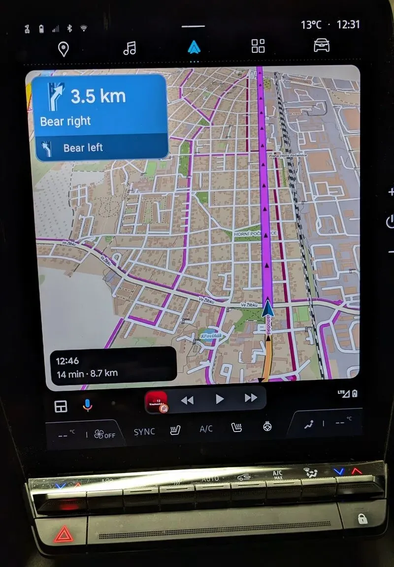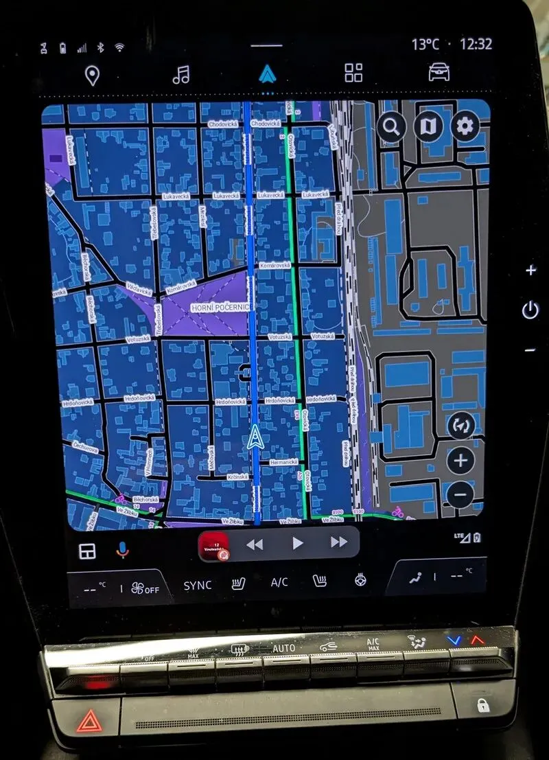 地图会根据您手机的设置自动选择,不过您也可以直接在 Android Auto 中更改此设置。您可以将地图居中、放大缩小,以及启用或禁用旋转。为了获得最佳效果,我们建议您选择 LoMap 的离线版本。这样不仅可以确保您在驾驶时即使在信号丢失的情况下也能看到地图,而且这些地图还支持旋转地图上的地名,使其与行驶方向保持一致。