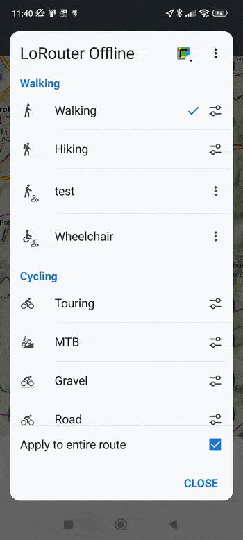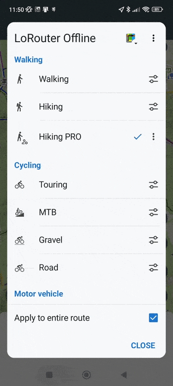 您可以将外部配置文件以 BRF 文件格式导入 Locus Maps(目前仅支持通过系统文件管理器导入,但我们正在开发直接导入功能)。在配置文件列表中,创建一个新配置文件,选择相应的外部文件,然后开始调整设置: