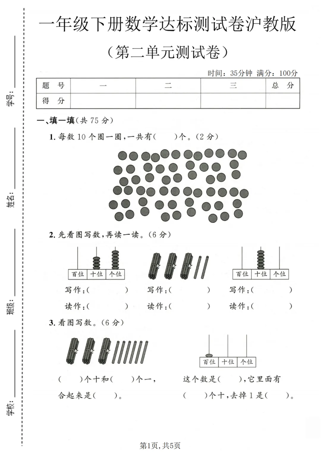 【免费下载】一年级(下)数学 第二单元达标测试卷《沪教版》,PDF电子版,可打印