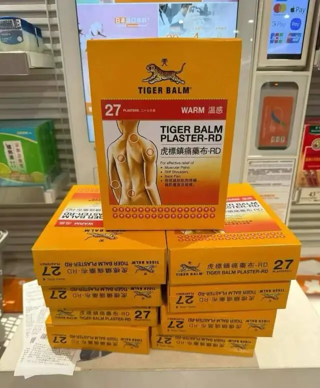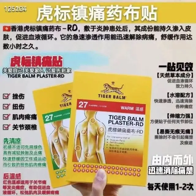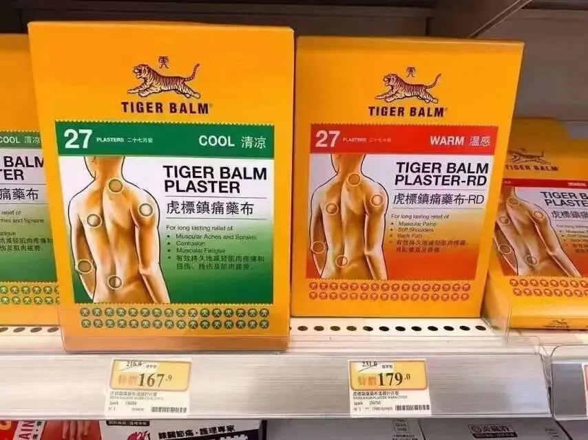 虎标镇痛膏药贴27片香港膏药推荐回购不断,哪疼贴哪!虎标贴,镇痛药布药膏贴,采用虎标万金油独家配方.持久舒解痛感,是治疗颈梗最有效的产品,产品配方独特,可舒解颈梗及肌肉疼痛,效力持久。药布敷贴舒适,有效缓解肩颈僵直、背部疼痛和肌肉疲劳。敷贴舒适,易贴易撕,不留痕迹!
