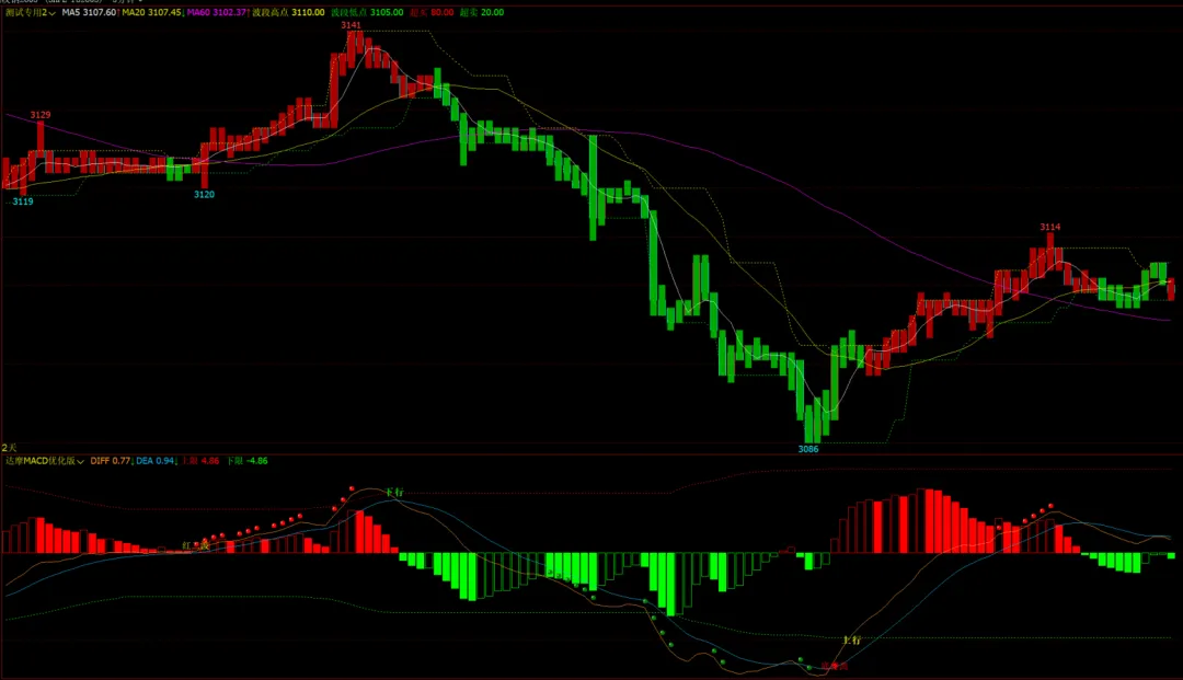 DRAWTEXT(买条件,L-MINPRICE*2,’买’),COLORRED; // 标注买字,放大字体 // 卖信号:空头趋势(MA5下穿MA20)+ 价格跌破波段低点 + RSI6>20(非超卖)