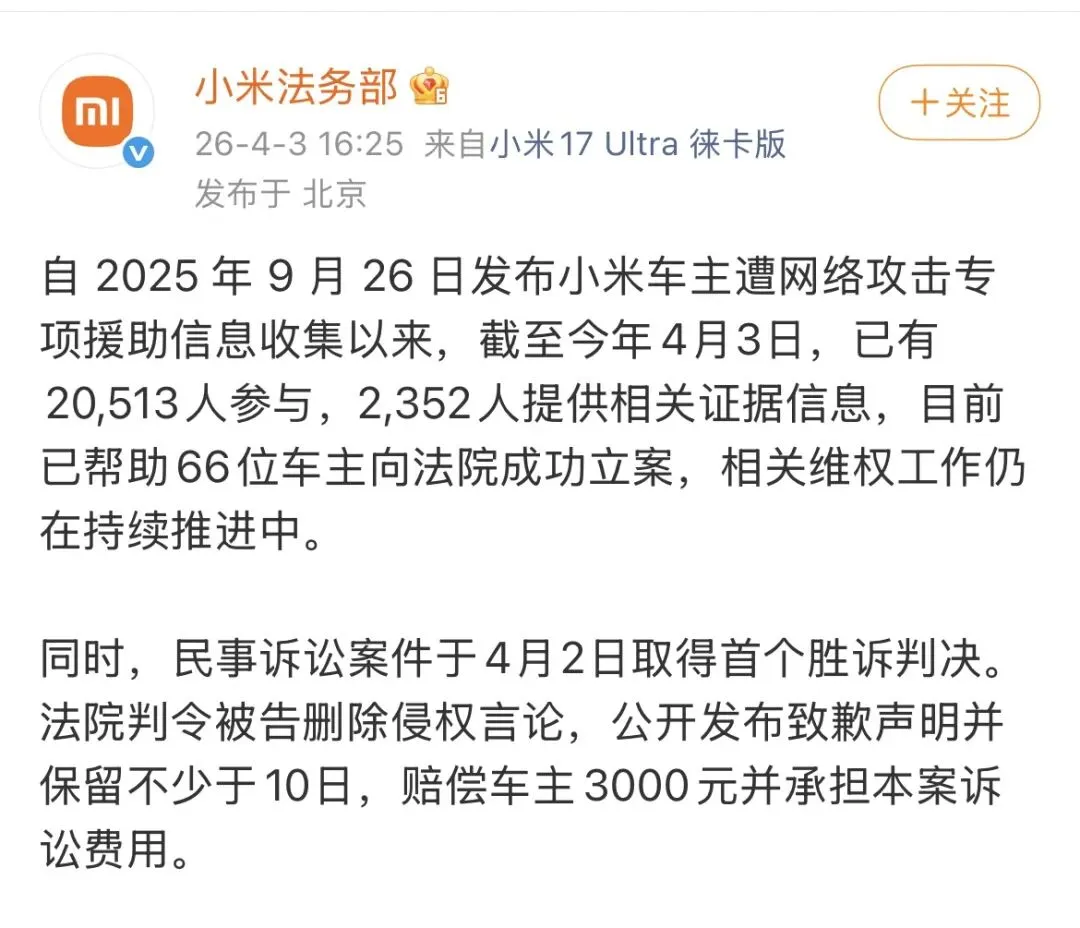 自 2025 年 9 月 26 日开放「小米车主遭网络攻击专项援助」以来,截至今年 4 月 3 日
