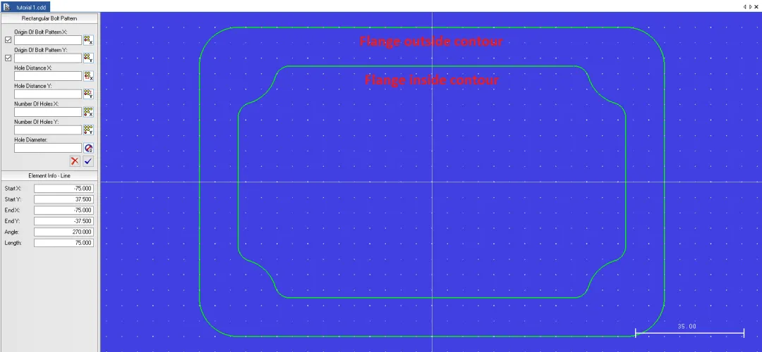 法兰外侧轮廓和法兰内侧轮廓均由 CNC-Calc 生成,但法兰当然必须带有安装孔。现在我们将使用 CNC-Calc 的“矩形螺栓孔图案”(几何)和“钻孔”(技术)功能来创建这些安装孔。