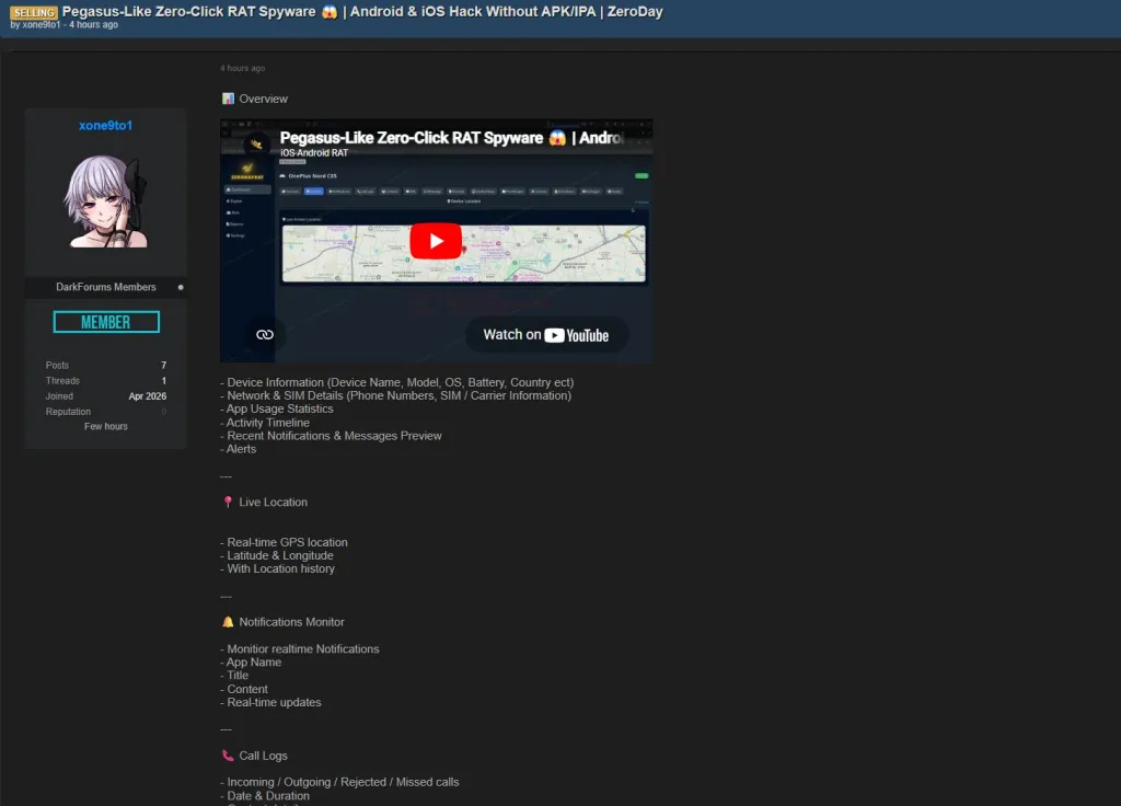 【导语】 近日,一名代号为 xone9to1 的黑客在知名网络犯罪论坛发布了一则令全球安全专家震惊的广告:一款号称具备“零点击”能力的顶级远程控制木马( RAT )正公开售卖。这款软件不仅打破了 iOS 与 Android 的系统壁垒,更直指目前最新的 iPhone 17 ( iOS 26.2 ) 设备。