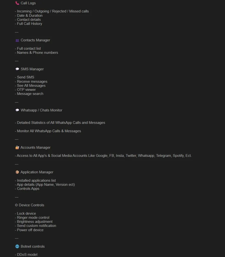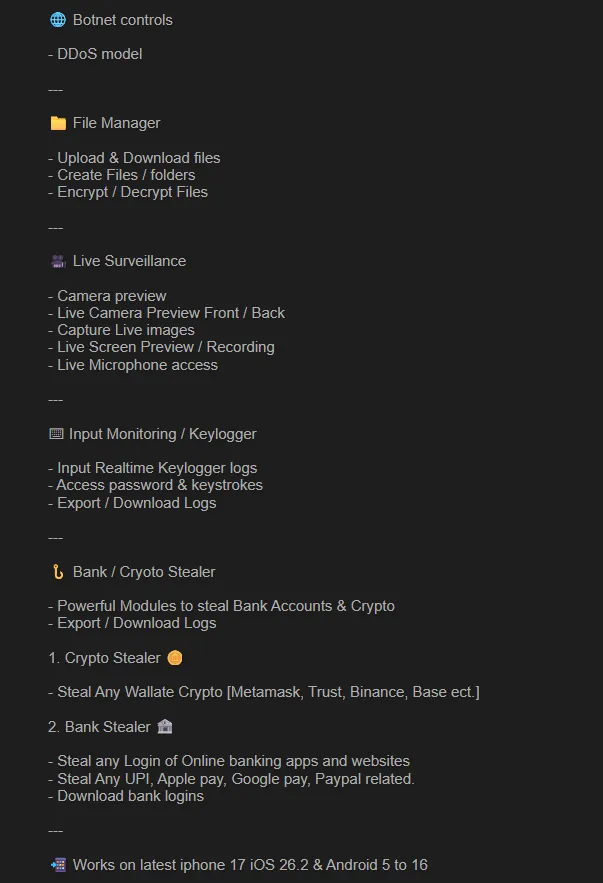 2. 恐怖的功能列表:手机变身“移动窃听器” 根据黑客公开的功能清单,一旦被感染,你的手机将毫无隐私可言: – 实时监控: 强制开启前后摄像头、实时截屏、麦克风监听。 – 资产洗劫: 内置银行与加密货币窃取模块,专门针对 MetaMask 、 Binance 、 Apple Pay 等支付平台。 – 社交全透视: 监控 WhatsApp 、 Telegram 等加密通信软件,甚至能直接读取 短信验证码( OTP )。 – 远程操控: 攻击者可以远程锁死手机、调整亮度和响铃,甚至将其变成僵尸网络的一员进行 DDoS 攻击。