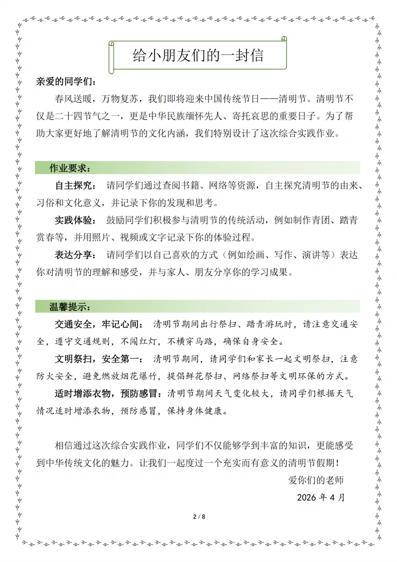 【26春】《清明节综合实践作业》PDF电子版,建议各位家长领取打印给孩子学习!