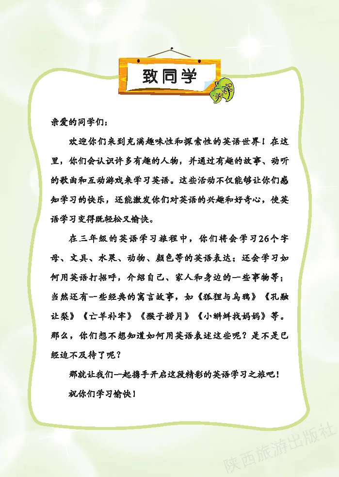 ,然后发送 电子课本 2026春新陕旅版(三起)三年级下册英语课本电子版,是依据《义务教育英语课程标准(2022年版)》编写,1:1复刻纸质教材的高清可打印PDF文件,适配三年级英语启蒙进阶需求,兼顾趣味性与基础性。全书共设置8个新授单元和2个复习单元,分为两个核心模块,第一模块(Units 1-4)围绕身体部位、家庭、职业展开,第二模块(Units 5-8)聚焦食物、水果、宠物、动物等生活化主题,每个模块结束后配套复习单元,帮助孩子梳理知识、查漏补缺。教材以主题对话为核心,搭配词汇学习、句型练习、趣味歌谣、课堂游戏和情景表演等活动,融入亲情、爱护动物、健康饮食等德育理念,实现“学语言、育品德”的双重目标,同时词汇和句型难度循序渐进,重点夯实基础词汇、核心句型和名词单复数基础,贴合三年级学生认知规律,电子版配套完整音频、教案课件等资源,方便孩子课前预习、课中跟读、课后复习,也便于家长辅助辅导,轻松满足启蒙阶段的学习需求。