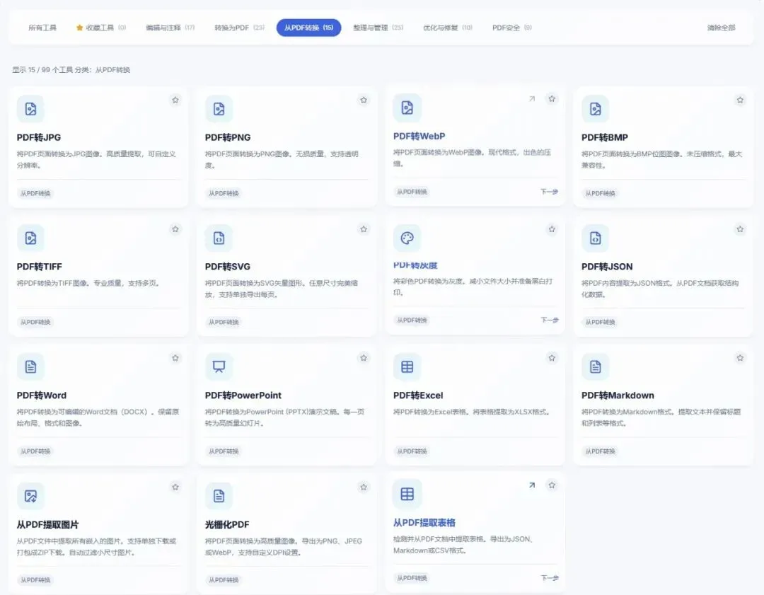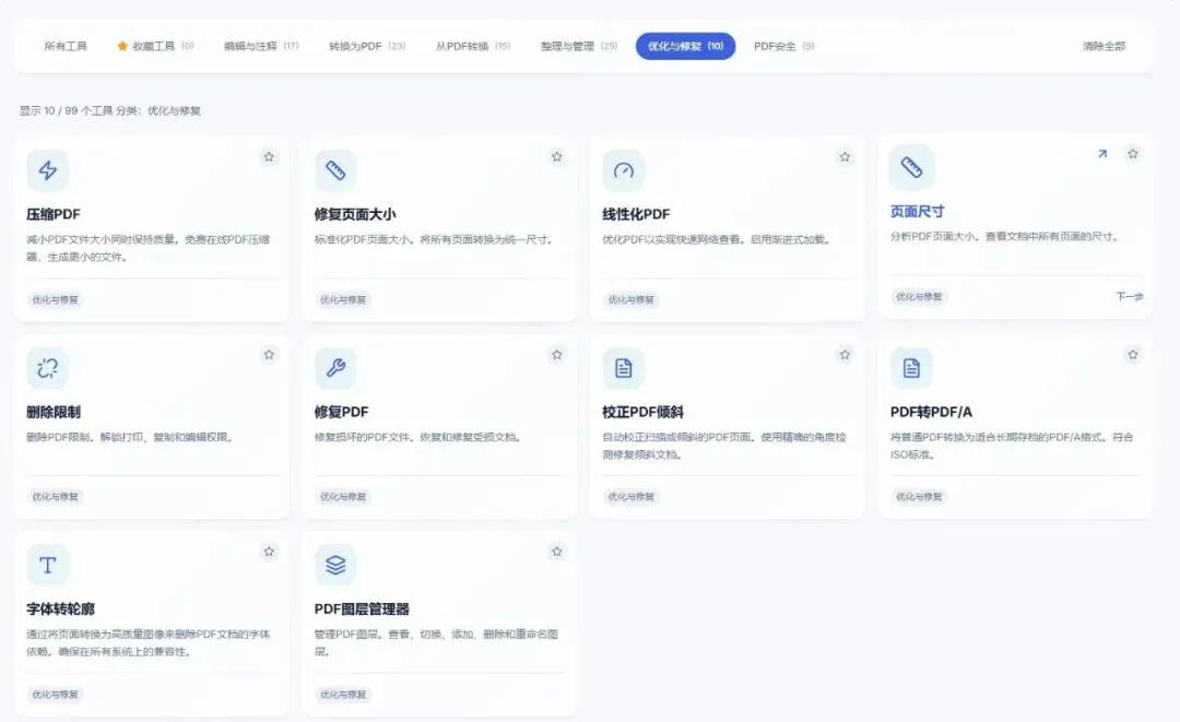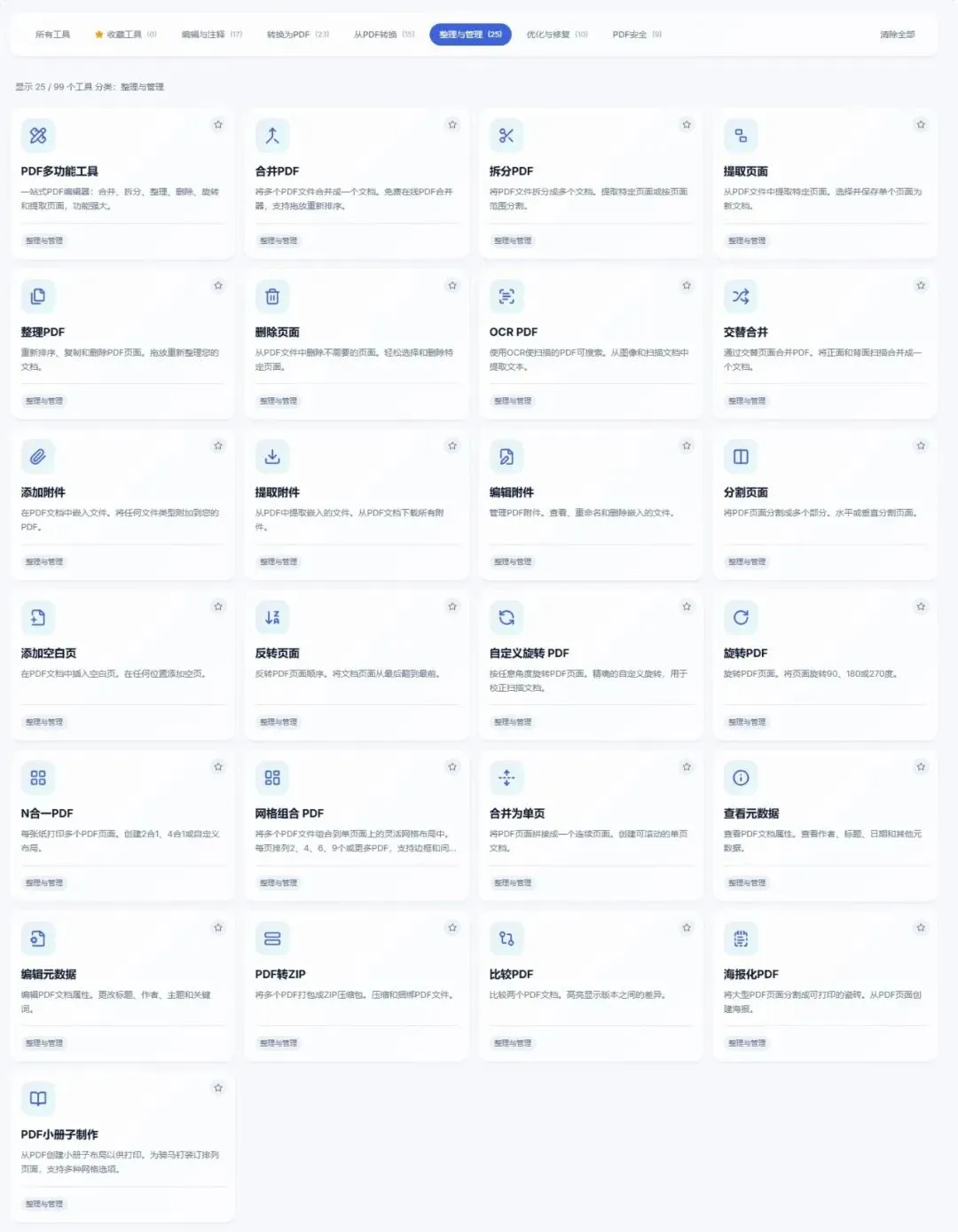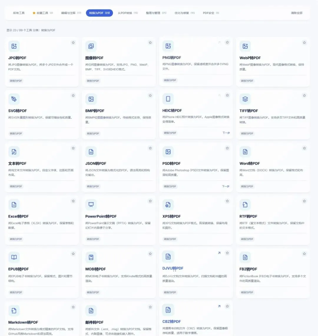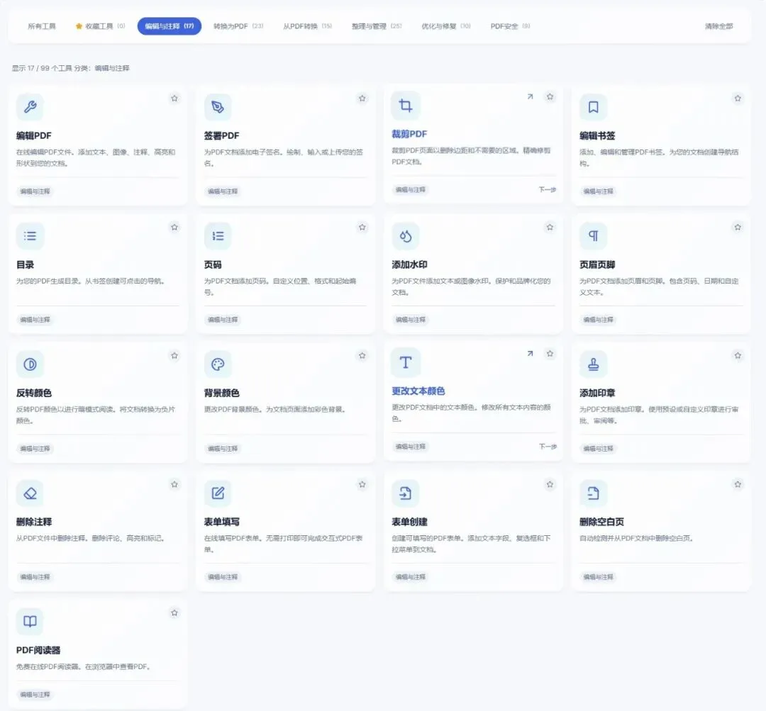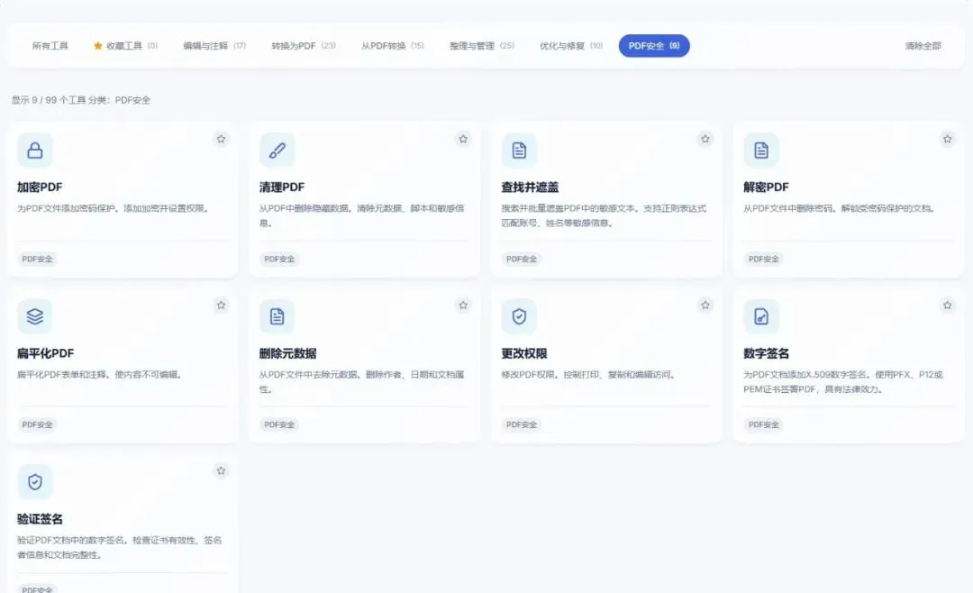 功能覆盖编辑注释、格式互转、页面管理、优化修复、安全加密 等5大核心场景,99+ 细分工具。