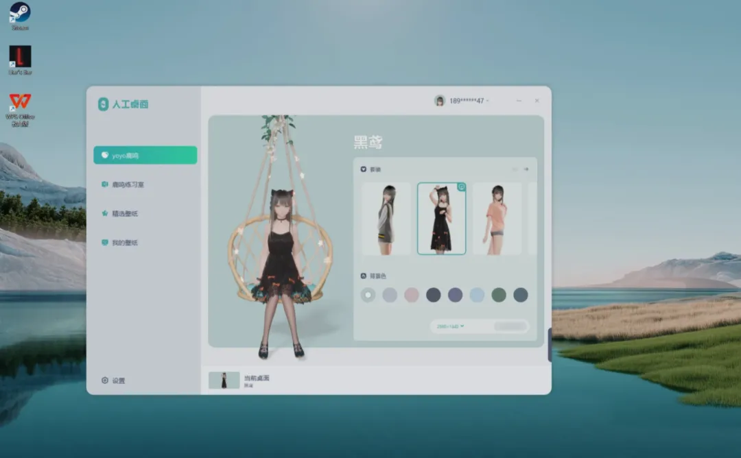 软件支持各种自定义设置,例如皮肤变色、衣服搭配、人物更换等,全都是可爱的二次元风,操作傻白式,直接点击就可以全部应用。调配好自己的设置后,直接点击下方的【当前桌面】,它就会自动设置成动态桌面。