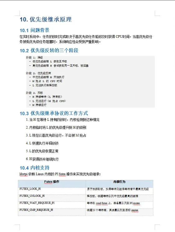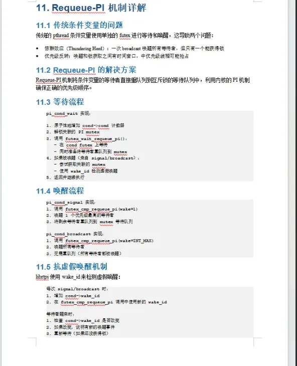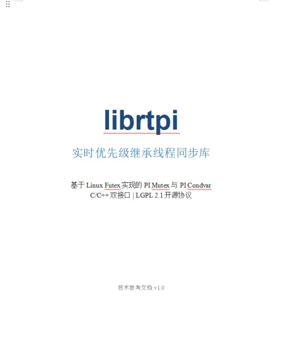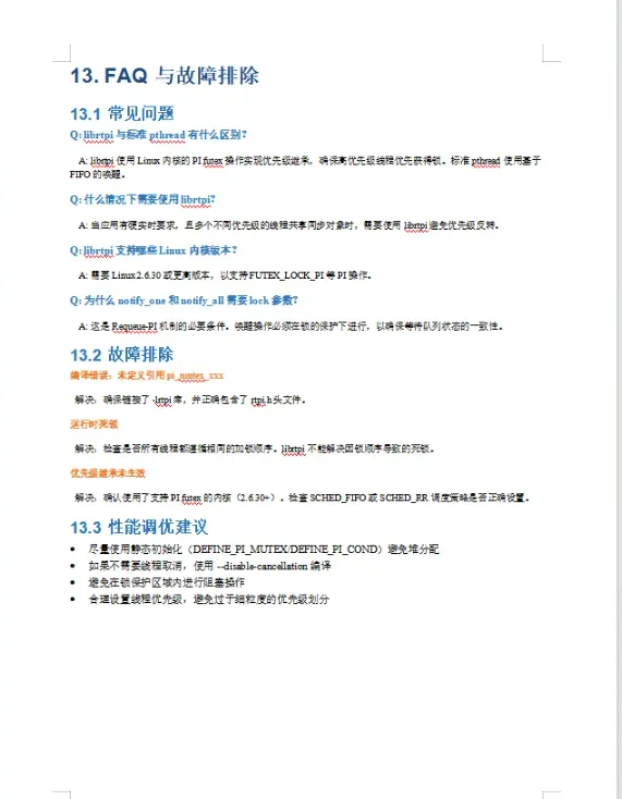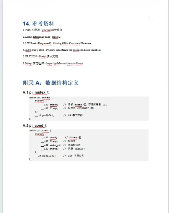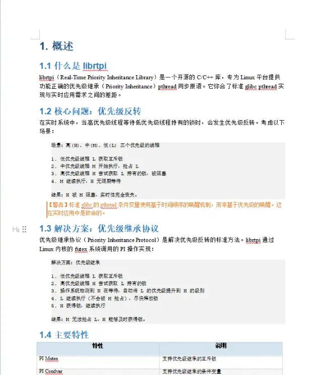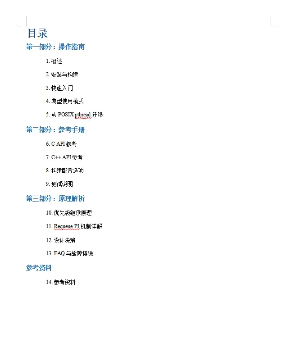 ● 文档已成功生成! 生成结果 文件: ~/claude/librtpi_技术参考文档.docx (48KB) 文档结构概览 ┌────────────────────┬───────┬──────────────────────────────────────────────────────────┐ │ 部分 │ 章节 │ 内容 │ ├────────────────────┼───────┼──────────────────────────────────────────────────────────┤ │ 封面 │ - │ 标题、副标题、版本信息 │ ├────────────────────┼───────┼──────────────────────────────────────────────────────────┤ │ 目录 │ - │ 三大部分索引 │ ├────────────────────┼───────┼──────────────────────────────────────────────────────────┤ │ 第一部分:操作指南 │ 1-5 │ 概述、安装构建、快速入门、典型使用模式、迁移指南 │ ├────────────────────┼───────┼──────────────────────────────────────────────────────────┤ │ 第二部分:参考手册 │ 6-9 │ C API、C++ API、构建选项、测试说明 │ ├────────────────────┼───────┼──────────────────────────────────────────────────────────┤ │ 第三部分:原理解析 │ 10-13 │ 优先级继承原理、Requeue-PI 机制、设计决策、FAQ与故障排除 │ ├────────────────────┼───────┼──────────────────────────────────────────────────────────┤ │ 附录 │ A │ 数据结构定义 │ └────────────────────┴───────┴──────────────────────────────────────────────────────────┘ 设计特点 - A4 页面,适合技术文档阅读 - 配色方案:深蓝色主色调 + 橙色强调色 - 代码块:灰色背景,便于区分 - 表格:交替行颜色 + 表头高亮 - 提示框:信息/警告/提示三种类型 - 层次结构:3级标题体系✻ Worked for7m 22s