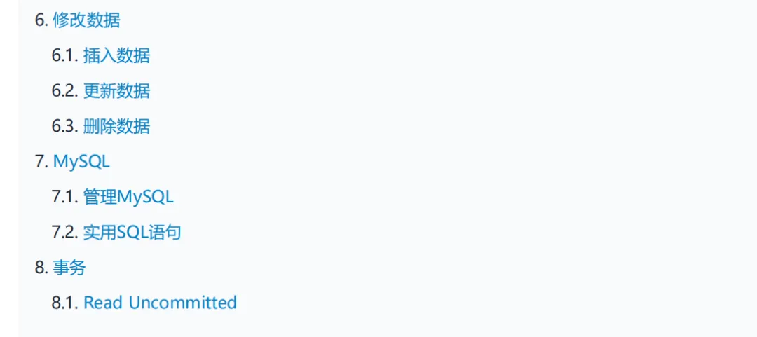 这部分难度略高于前两节,是 SQL 进阶的核心:首先讲解数据修改的完整流程,包括插入新数据(INSERT)、更新已有数据(UPDATE)、删除冗余数据(DELETE);接着补充 MySQL 的日常管理技巧和高频实用 SQL 语句;最后重点讲解数据库事务相关知识,包括 read uncommitted(读未提交)、read committed(读已提交)、repeatable read(可重复读)、serializable(串行化)四种事务隔离级别,这是保证数据操作安全性的关键。