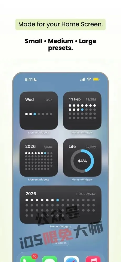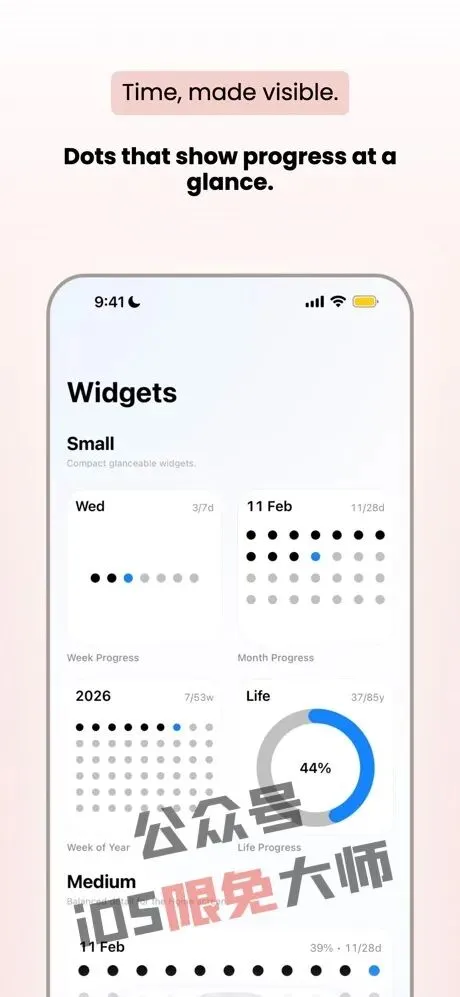 【Moment Widgets: Time Progress】一款可视化时间追踪工具,能将抽象时间转化为一系列温和的点状进度图示,让你在每个瞬间保持专注、动力与目标感。