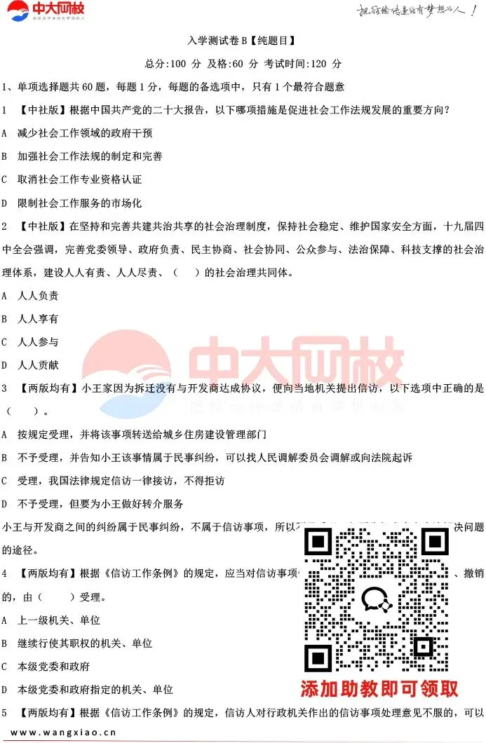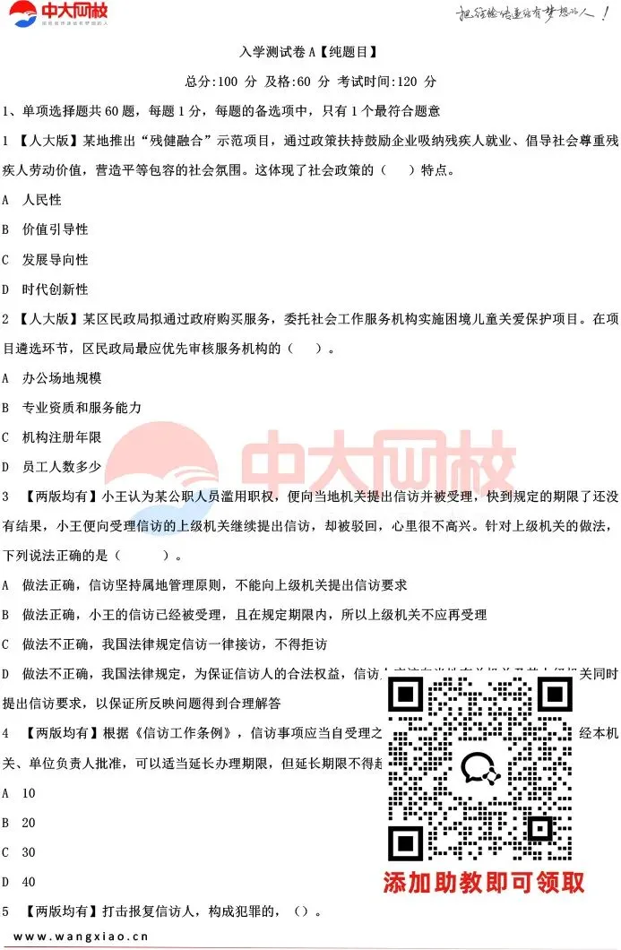 为帮大家精准定位薄弱环节、高效查漏补缺,中大网校社工教研团队精心整理出中级法规80题入学测试卷,贴合考纲、覆盖高频考点,做完立刻摸清备考短板,让后续冲刺更有方向。