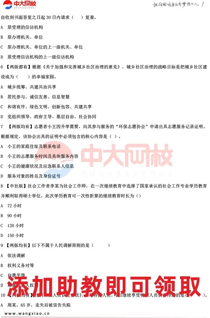 四十余天的冲刺时间,每一分努力都能转化为提分动力,为助力考生精准冲刺,中大网校教研团队整理了专属备考资料和个性化备考规划,考生添加助教老师微信,即可免费获取,专业指导带你避开备考误区,高效冲关社工考试!