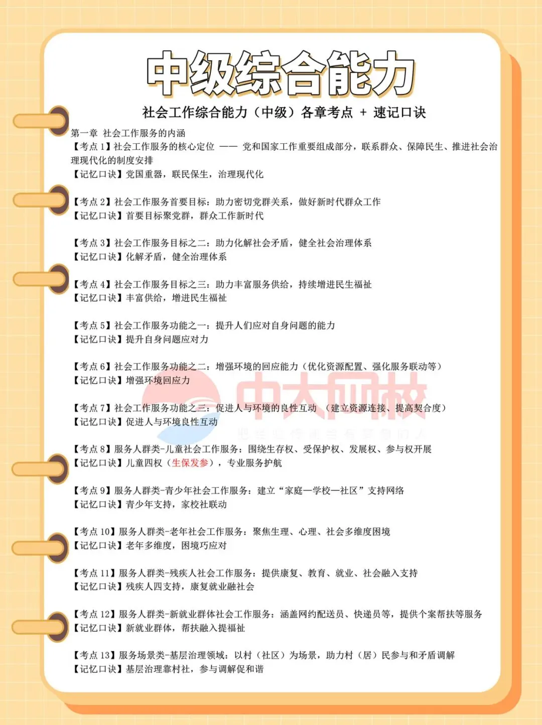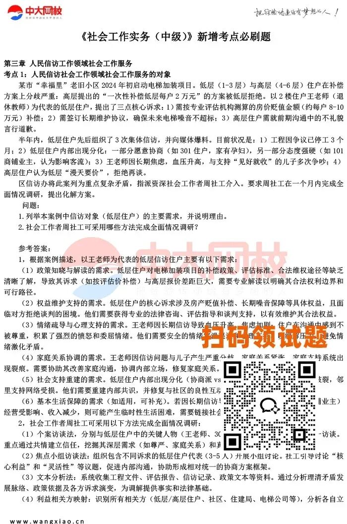 2026年社会工作师考试新版教材章节繁多、知识点庞杂,中大网校针对新版教材精心研发了各科目思维导图 、章节试题 、初中级各科目50个必会考点、新增考点必做题等资料,帮助考生掌握核心考点、提升答题技巧,实现高效备考,考生可添加助教老师微信咨询获取哦。