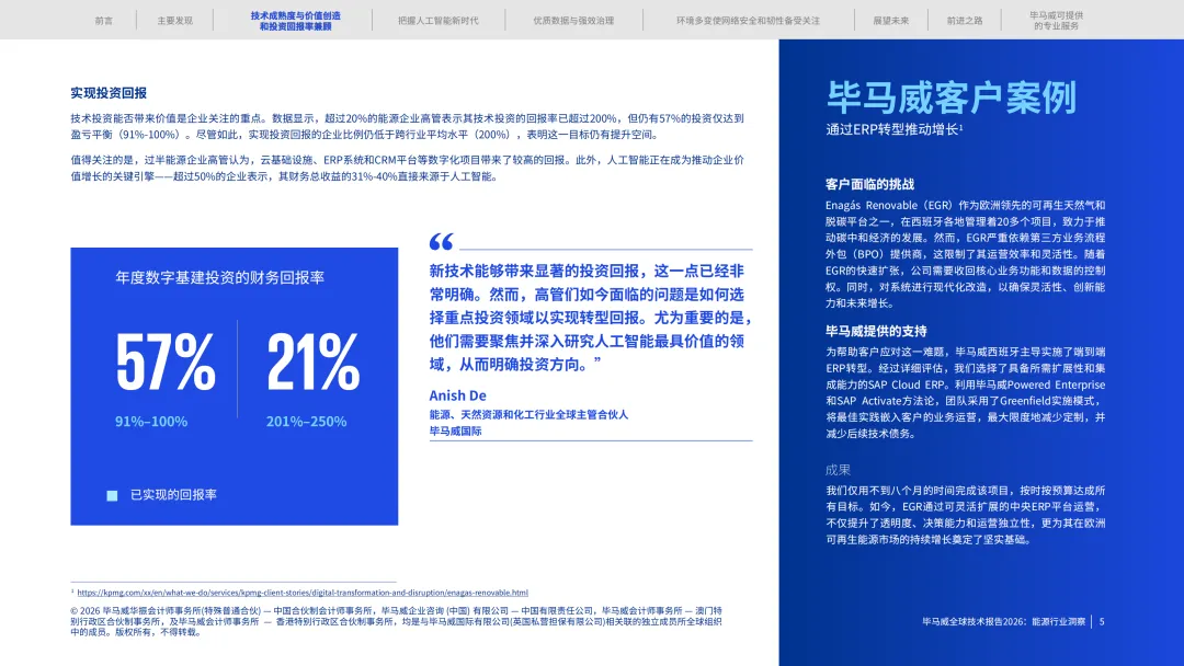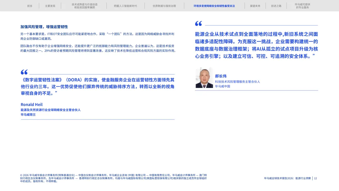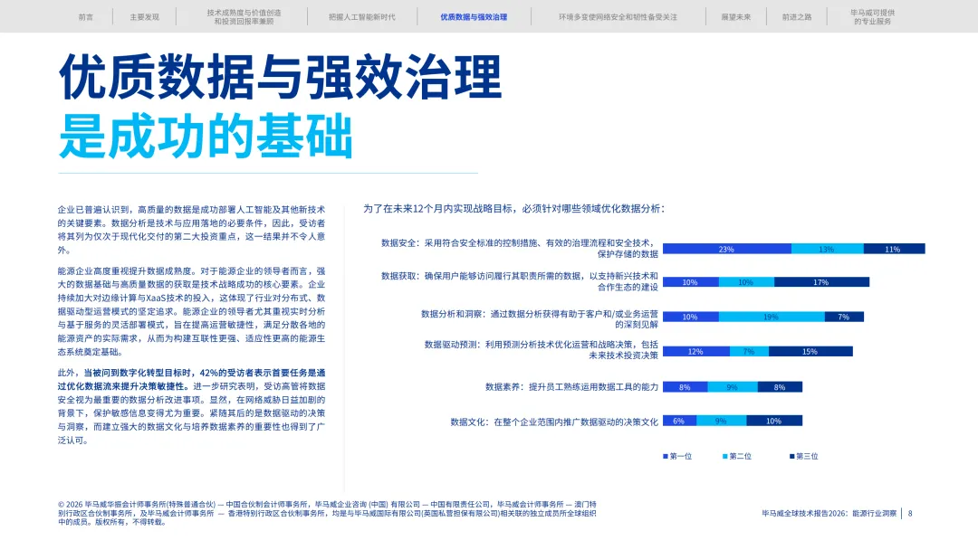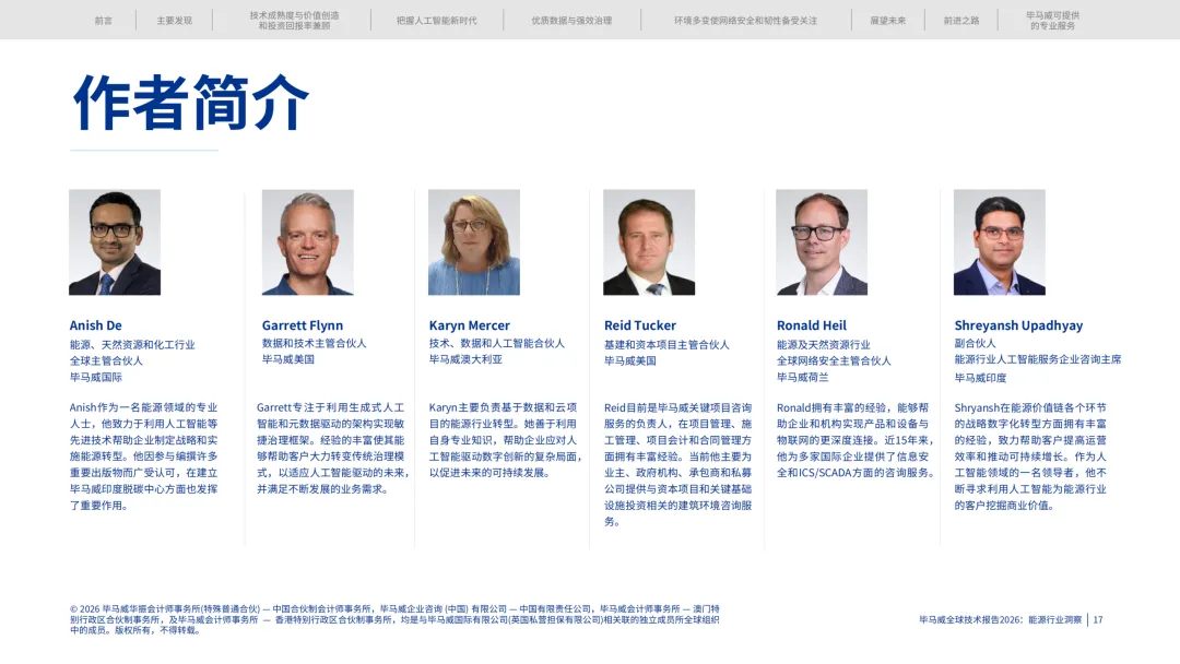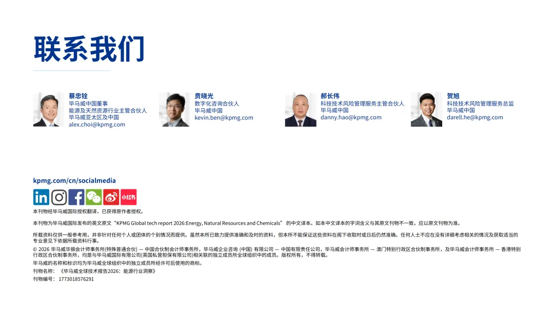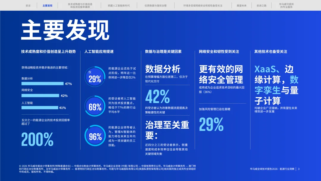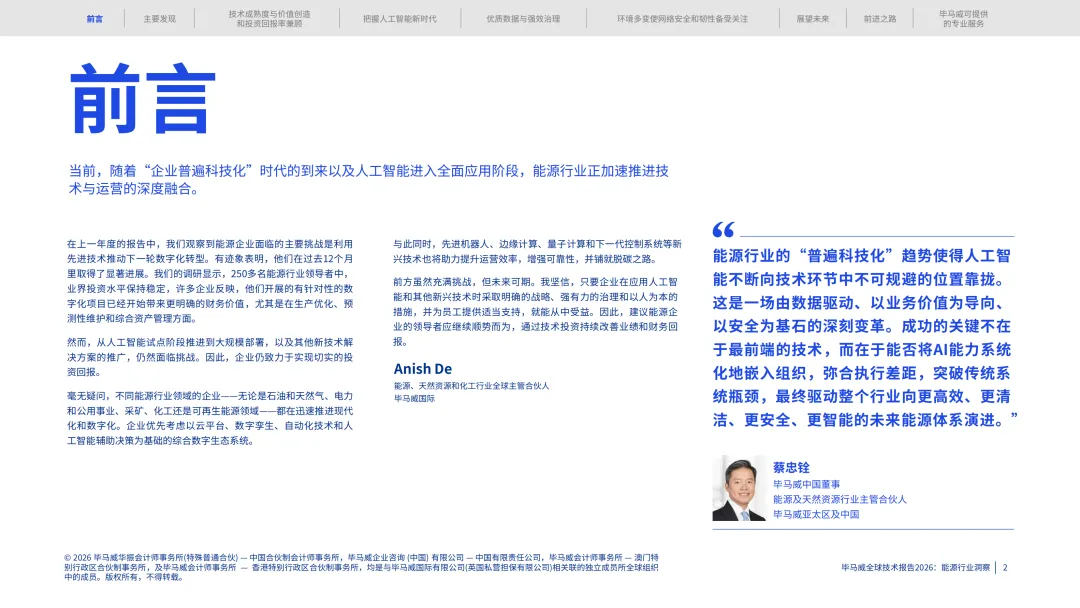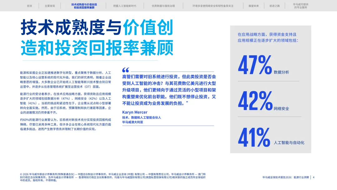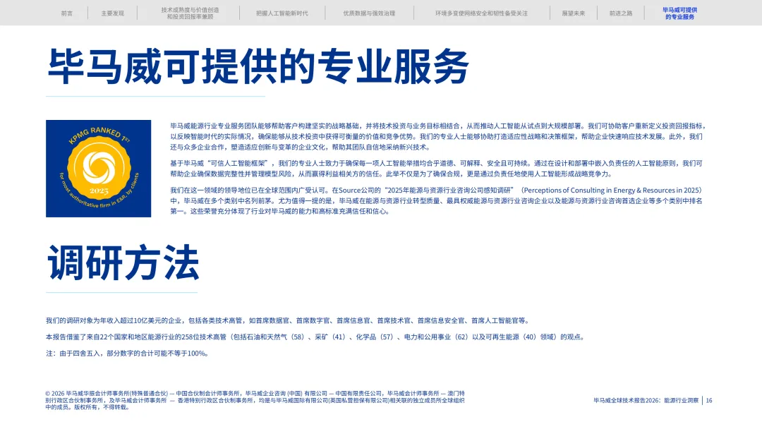 这份《毕马威全球技术报告2026:能源行业洞察》全面梳理了能源行业在智能化转型中的关键趋势、挑战与战略方向。以下是提炼的核心内容要点,便于快速把握报告精髓: