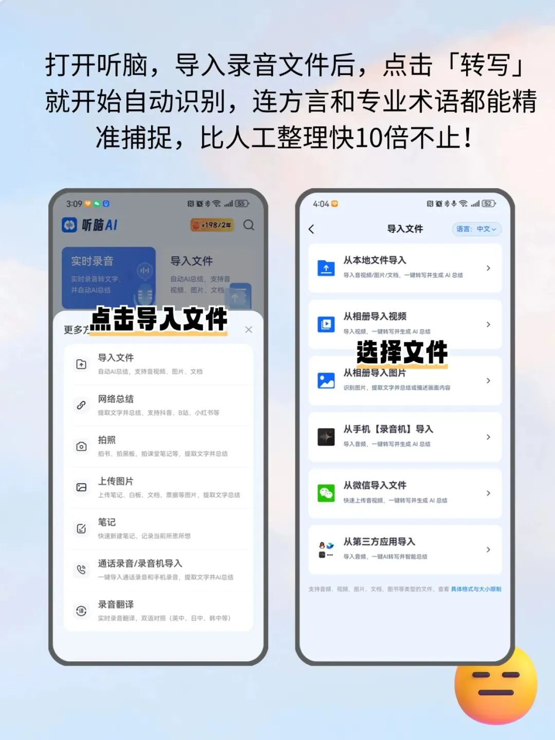 选把录音转文字的app先测场景适配度,不要上来就买年卡,先拿你之前录的带口音、有杂音的旧拜访录音测,转写准确率能到95%以上再考虑付费,听脑AI新用户有免费额度,你可以先传3条旧录音试,合适再用,完全没成本。