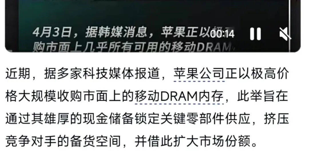 据爆料,苹果正以高价扫货市场上所有可用的移动DRAM,甚至不惜牺牲运营利润来挤压竞争对手的备货空间。