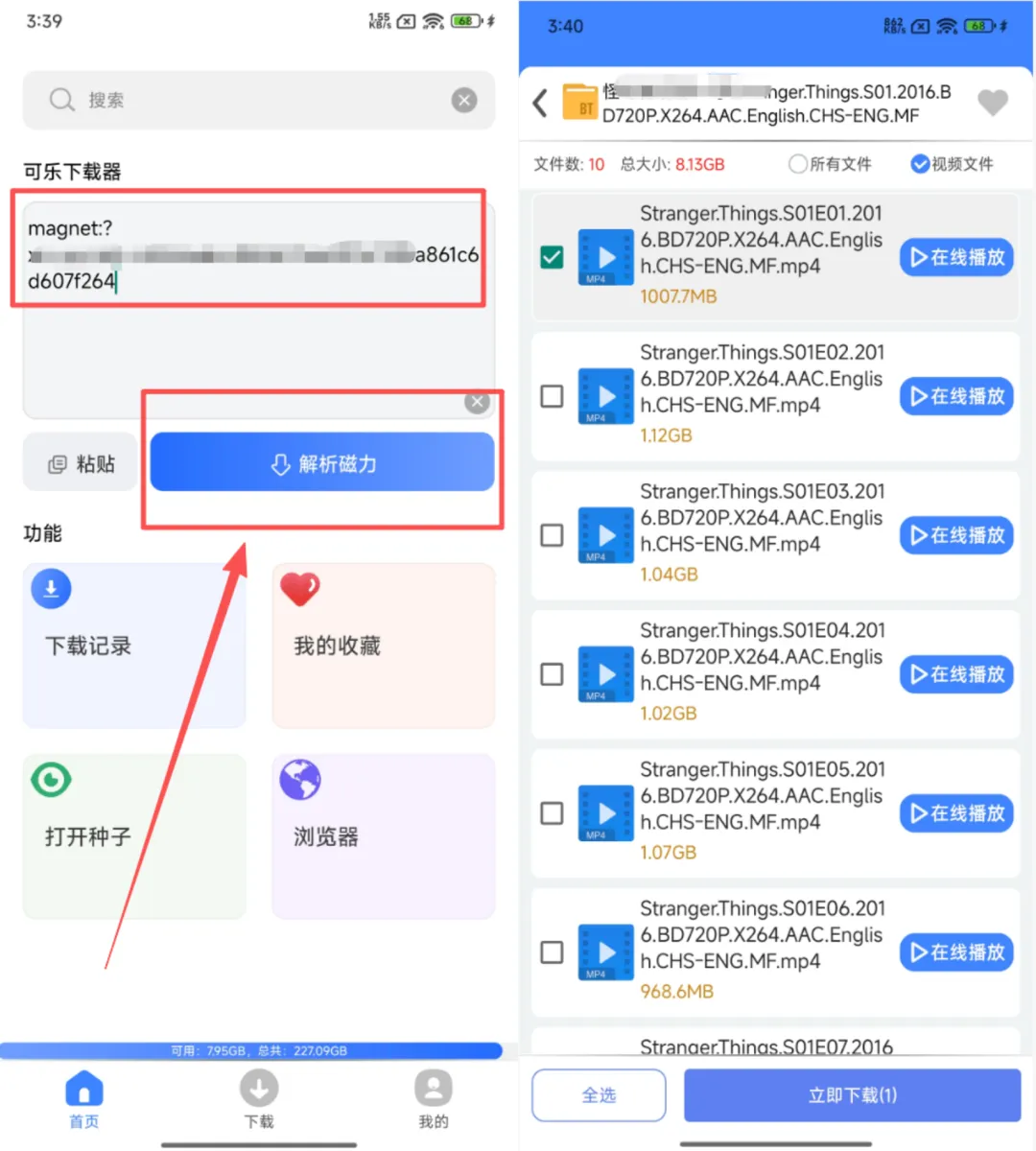 操作起来非常简单,把你找到的磁力链接复制过来,粘贴到软件里,点一下解析磁力按钮,等几秒就能解析完成。如果磁力资源里包含视频,还能直接在软件里在线预览播放,视频加载速度很给力,不用等太久就能看。