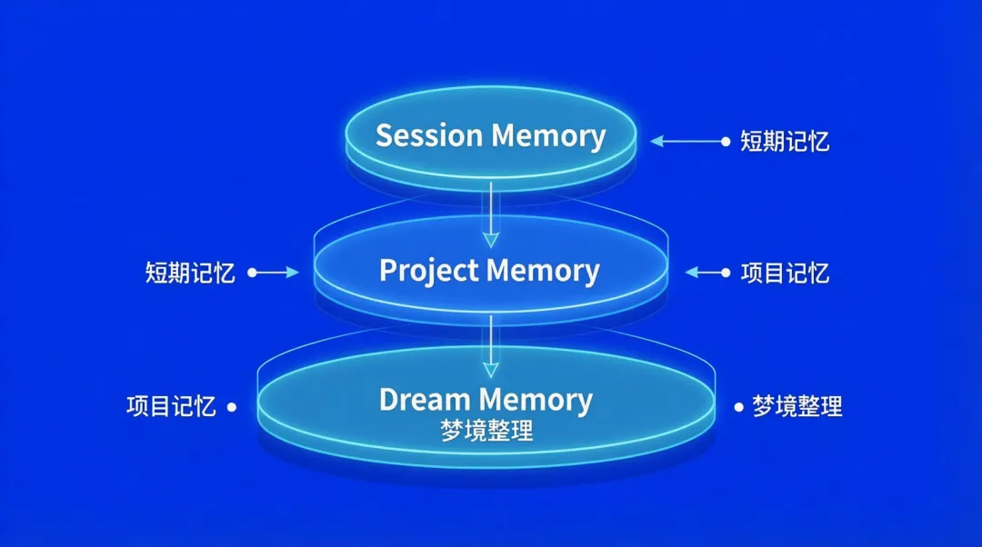 ┌─────────────────────────────────────────┐│ Session Memory ││ (当前会话的短期记忆,实时访问) │├─────────────────────────────────────────┤│ Project Memory ││ (项目级记忆,跨会话持久化,CLAUDE.md) │├─────────────────────────────────────────┤│ Dream Memory ││ (后台整理,压缩冗余,提取模式) │└─────────────────────────────────────────┘