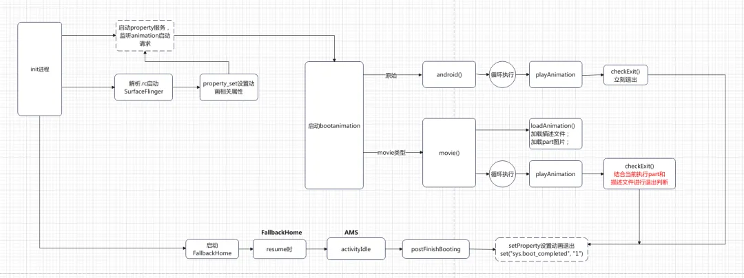FallbackHome启动后通过AMS->postFinishBooting设置”sys.boot_completed”,结束动画