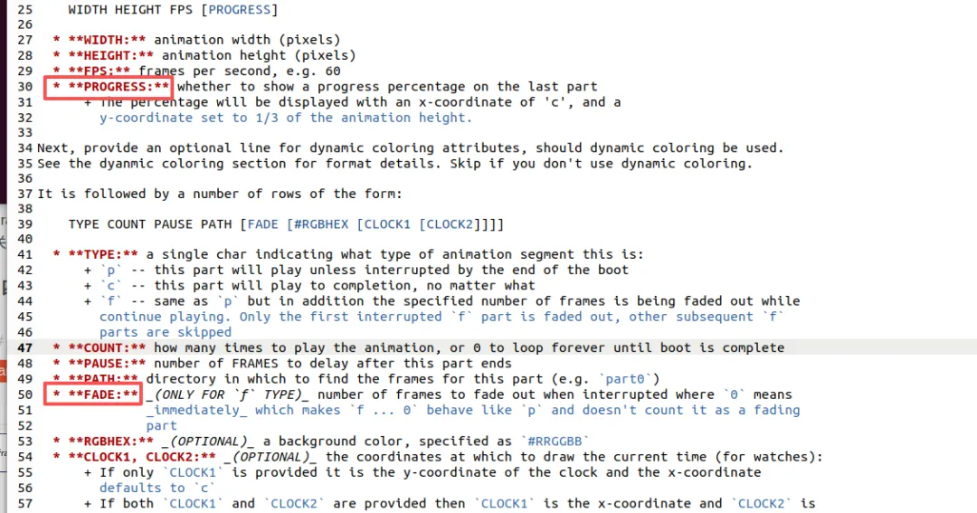FADE好像是设置退出时的淡出效果,收到后用N帧平滑淡出。PROGRESS是否在最后一part显示进度条?