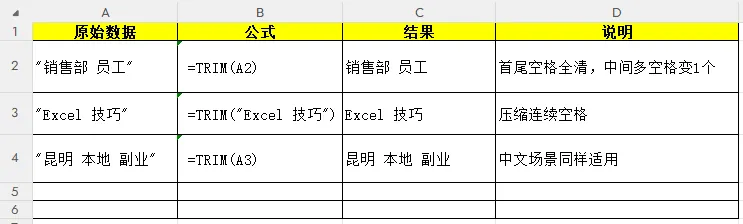 TRIM函数是Excel文本处理函数,核心作用超简单:除单词/汉字间单个必要空格外,清除文本所有多余空格 。
