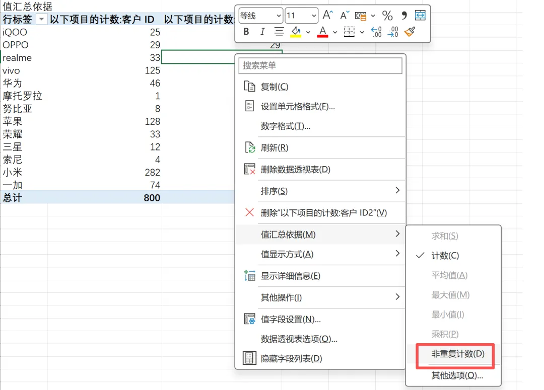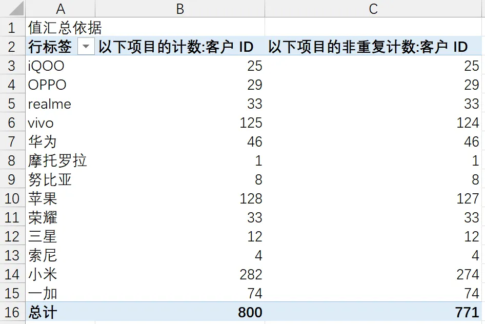 二是数据透视表的值字段支持多次加入同一列,用于创建不同的值汇总依据(比如:此案例将“客户ID”分2次加入值字段,分别用于普通计数和非重复计数)