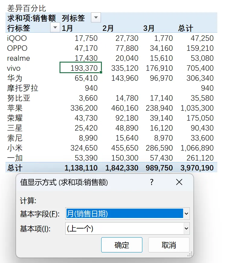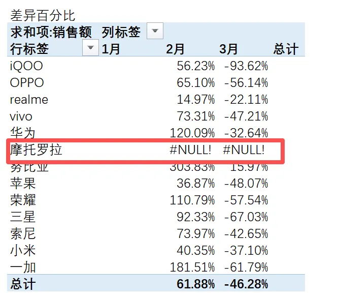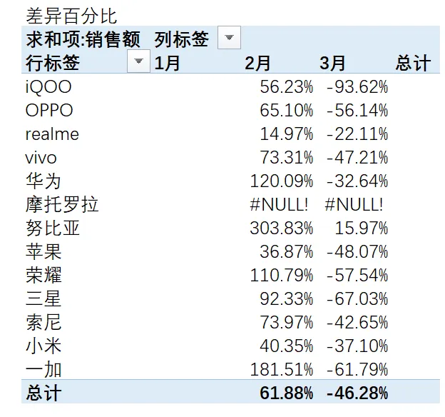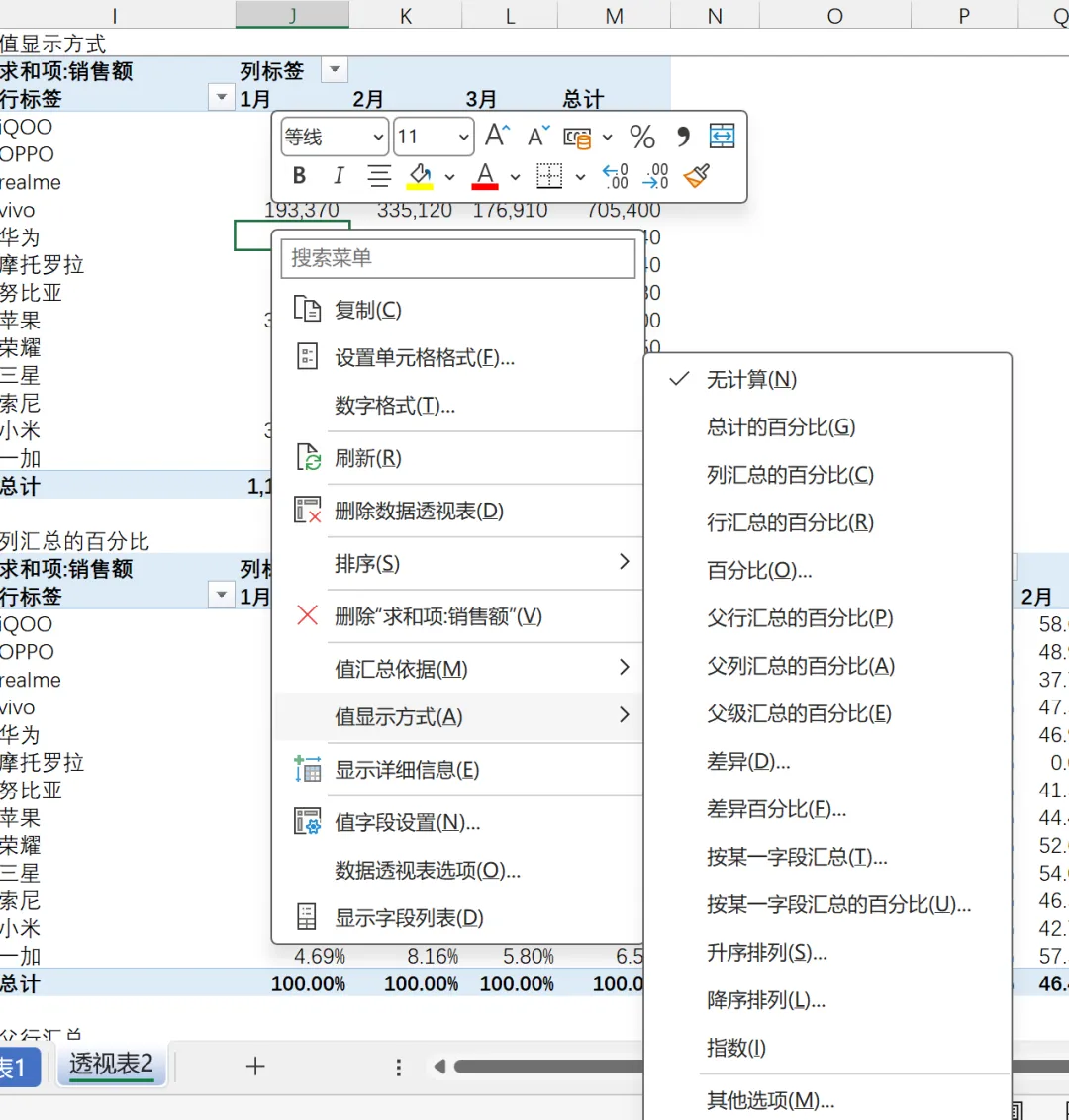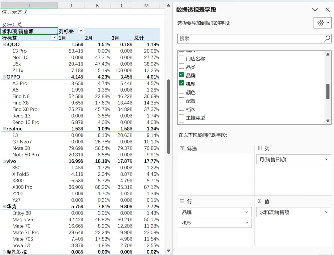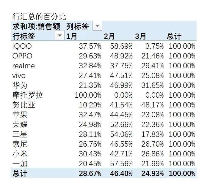【行汇总百分比】看同一手机品牌,不同月份的销售占比。比如: