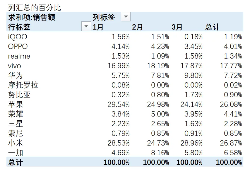 【列汇总百分比】看每月不同品牌手机的销售占比。比如:1月销售中,苹果占多少、小米占多少