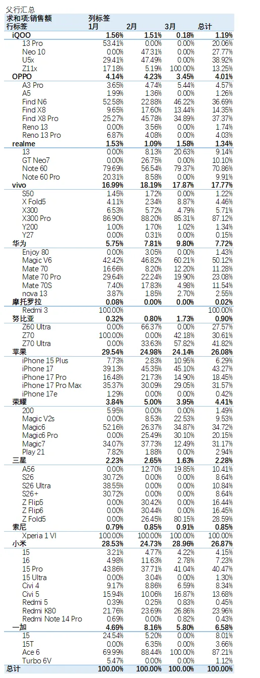 【汇总结果】如:IQOO的1月销售占比为所有品牌的1.56%,而IQOO 13Pro占IQOO 1月销售总额的 53.41%