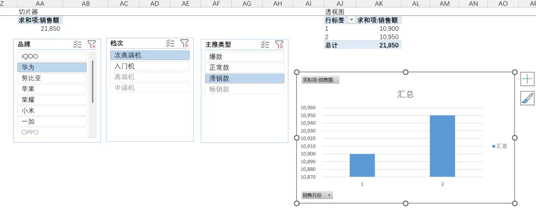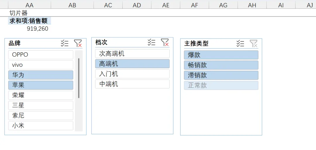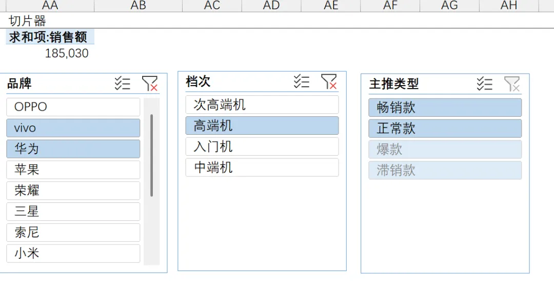按住Ctrl,可以对同一切片器的选项进行多选:比如:品牌选择华为和苹果