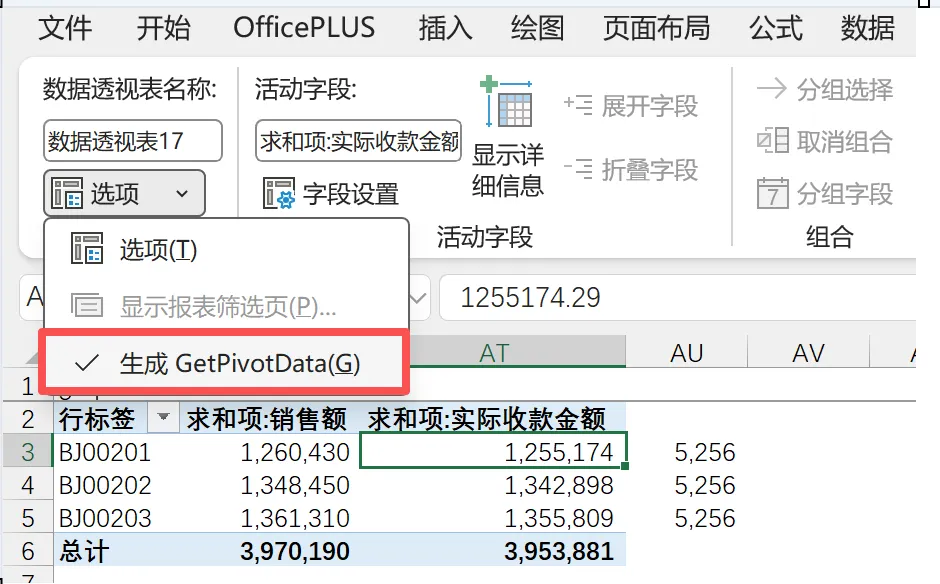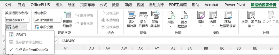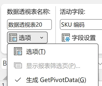 GetPivotData是在数据透视表分析选项卡中的“选项”下拉菜单: