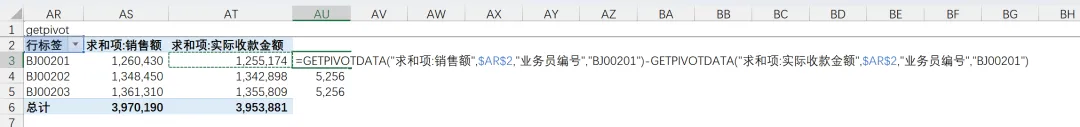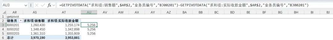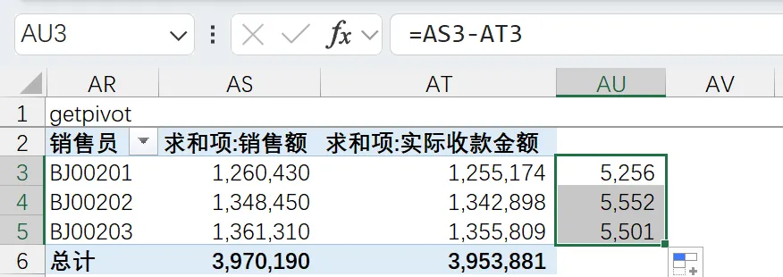 我在AU3单元格进行AS3-AT3的操作,公式会自动显示成GetPivotData开头的字样
