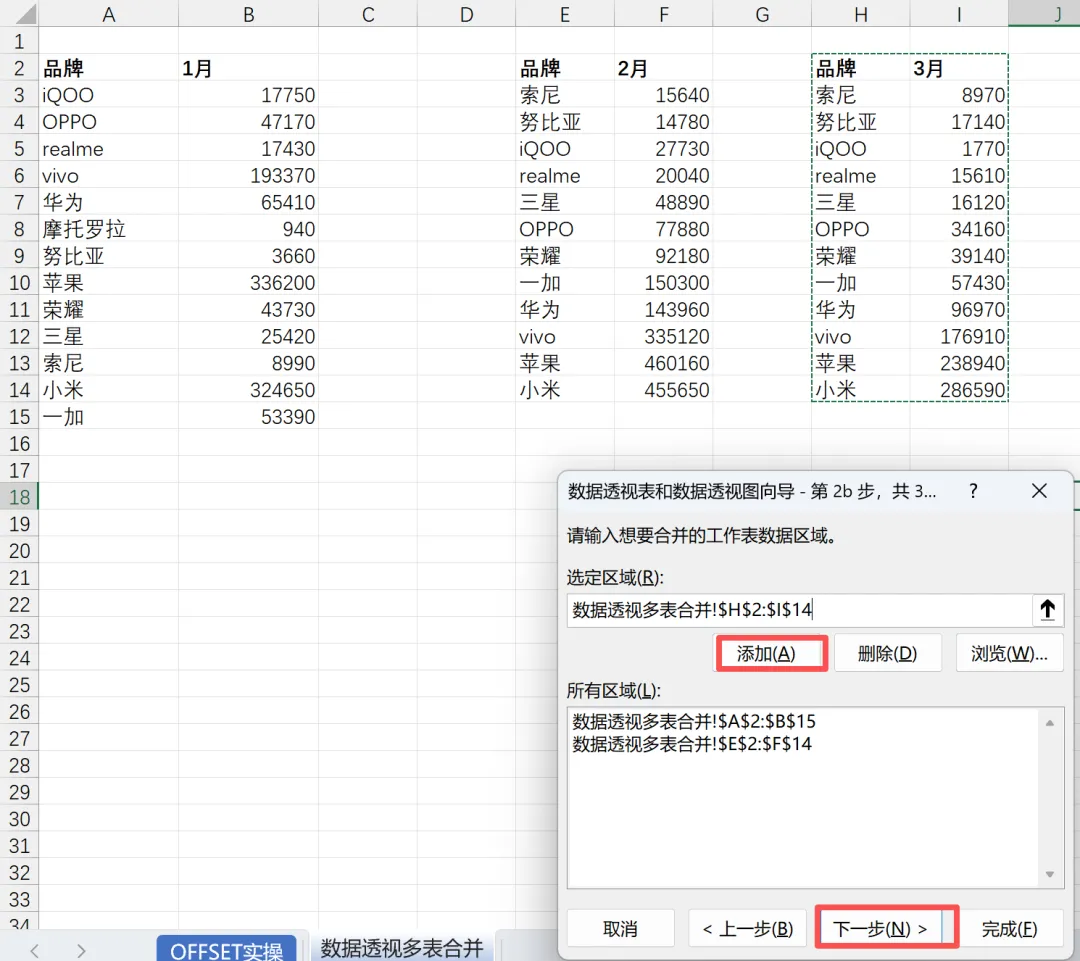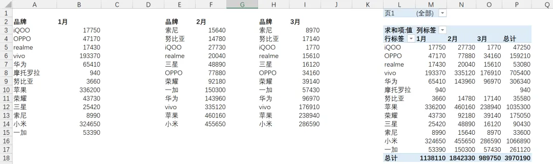 不需要不同月份的品牌列表完全相同(如:2 月有摩托罗拉,3 月没有,不影响最终汇总)