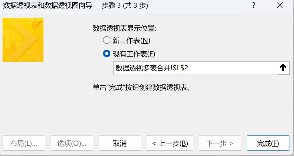 Step4:确定数据透视表(即:合并后的数据)的放置位置,点击完成即可