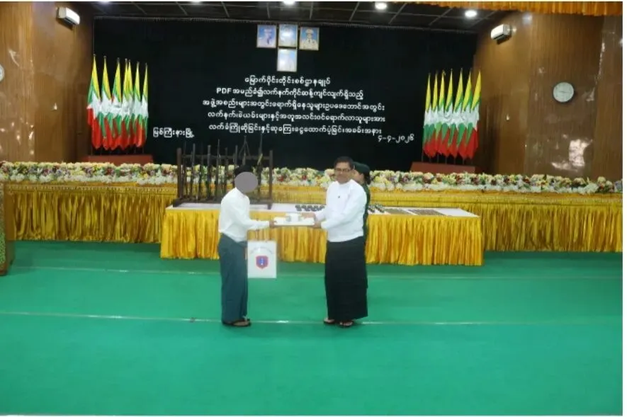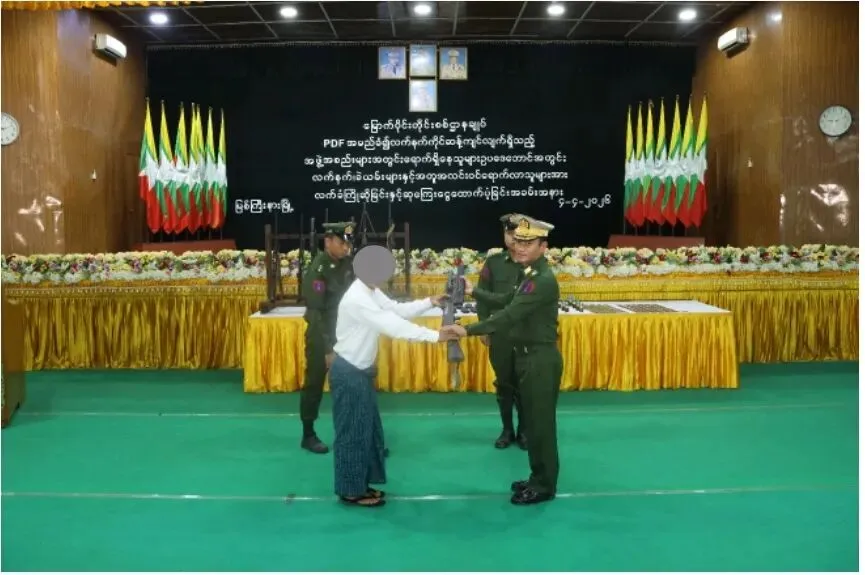 随后,官员们颁发了奖励:4支自动步枪奖励2000万缅元,2支冲锋枪奖励1000万缅元,1支MA-4步枪奖励750万缅元,2具K-25榴弹发射器奖励1500万缅元,1枚MG-1手榴弹奖励30万缅元,共计5280万缅元。此外,还向回归人员额外奖励800万缅元,总计6080万缅元。他们还签署了承诺书,并被系统地移交回父母身边。其中一名回归人员表达了感激之情。