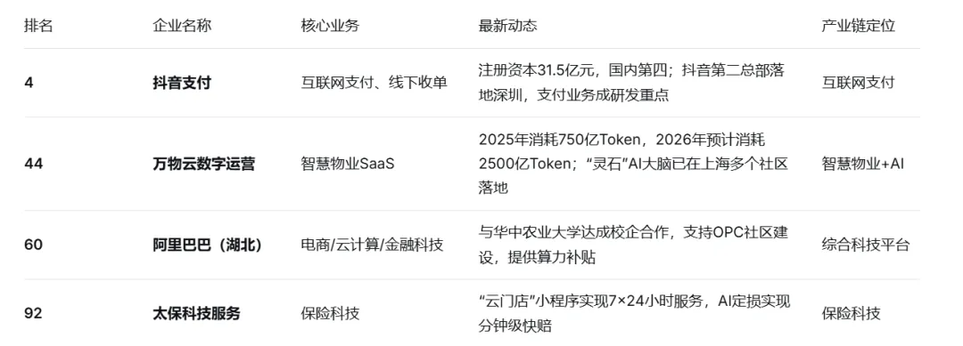 抖音支付注册资本31.5亿元,跃居国内支付机构第四位,正在支撑抖音数亿用户的交易闭环;万物云的“灵石”AI大脑,用2500亿Token重构物业管理,让老旧小区“起死回生”;阿里巴巴湖北公司扎根武汉,推动通义大模型、阿里云、自研芯片落地;中国太保科技服务用“云门店”让保险服务触手可及……