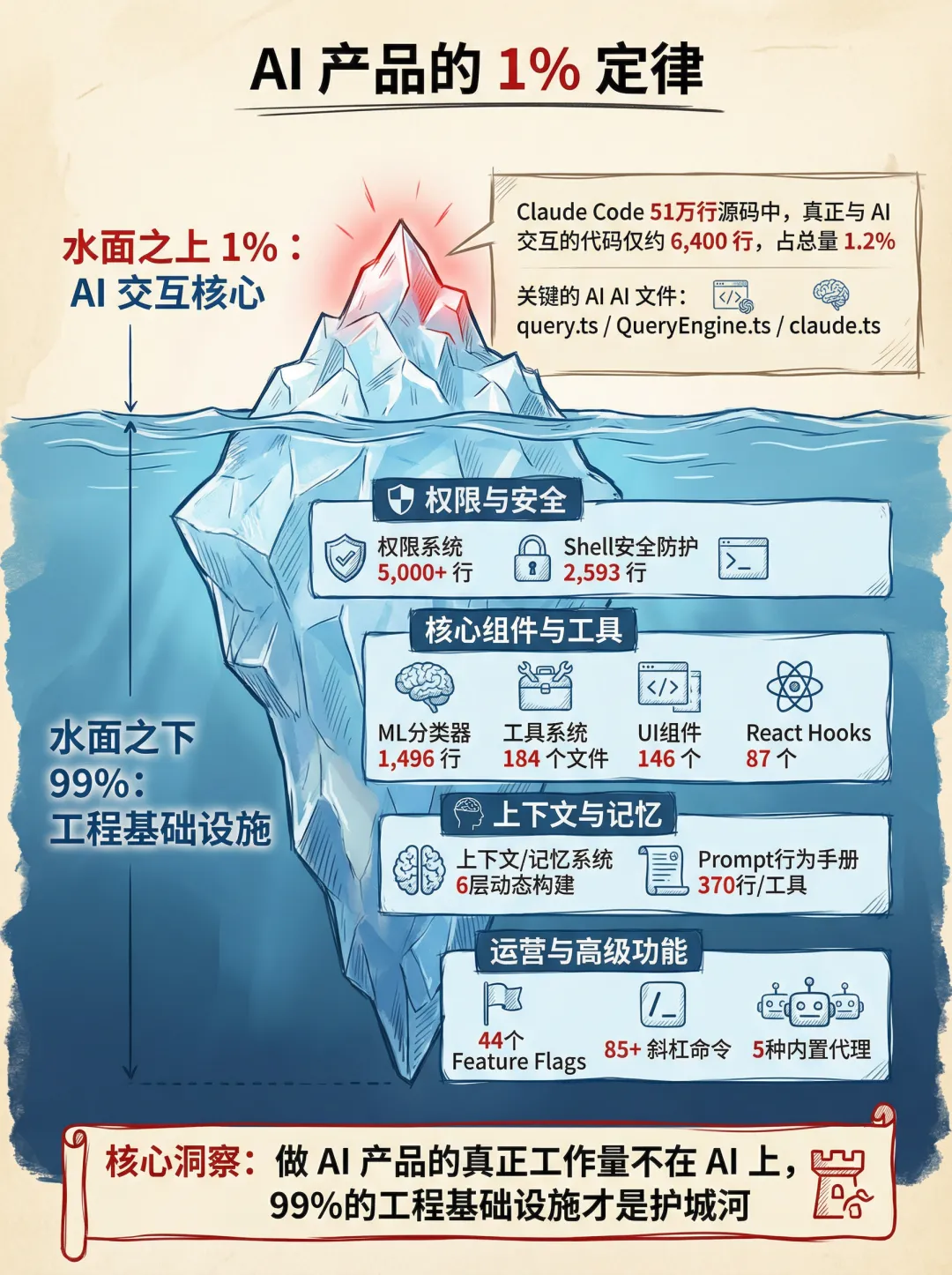 与 AI 模型交互的核心代码只有约 6,400 行,占总量 1.2%。剩下 50 万行全部是让 AI 安全、准确、高效工作的基础设施。据社区分析,还有大量 internal-only 模块在泄露中缺失,我们看到的只是冰山一角。