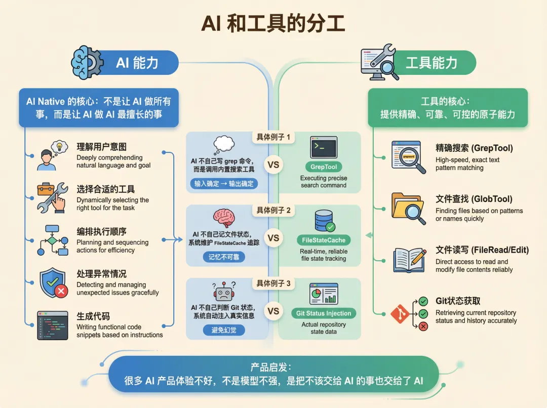 背后的产品判断:AI 的价值不在于「能做所有事」,而在于「知道该做什么以及谁来做」。 AI 擅长理解意图、选择工具、编排顺序、处理异常。精确搜索、确定性匹配、文件操作,交给专门工具更可靠。