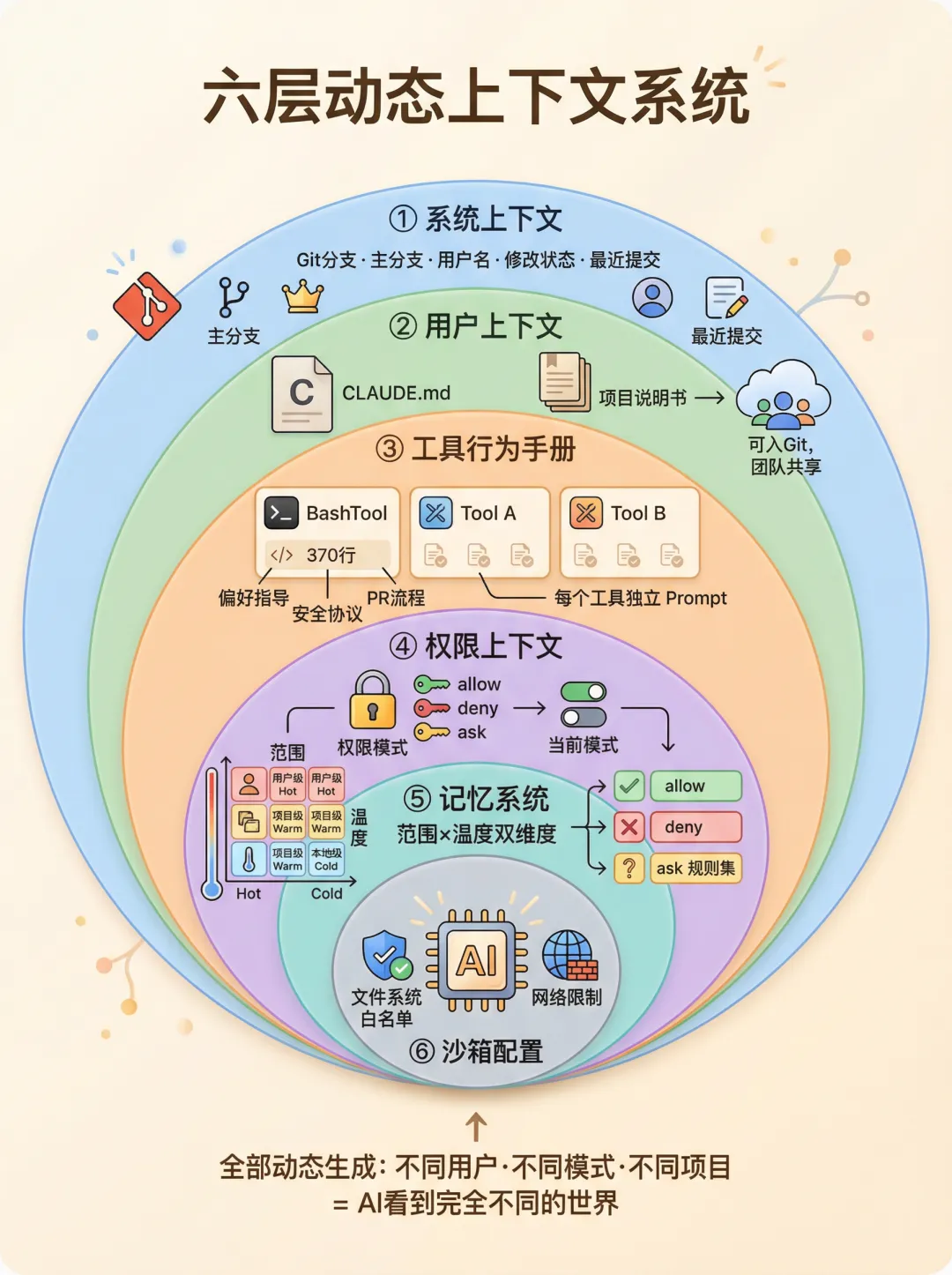 这个差距来自六层动态上下文系统:系统上下文(Git 状态自动获取)→ 用户上下文(CLAUDE.md 项目说明书,可入 Git 团队共享)→ 工具行为手册(BashTool 370 行的「AI 员工手册」)→ 权限上下文 → 记忆系统(范围×温度双维度:用户级/项目级/本地级 × Hot/Warm/Cold)→ 沙箱配置。