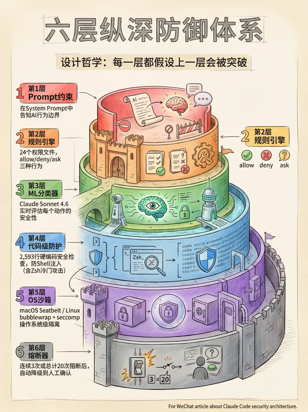 Claude Code 的做法是设六道关卡,每一道都假设前一道会失败: