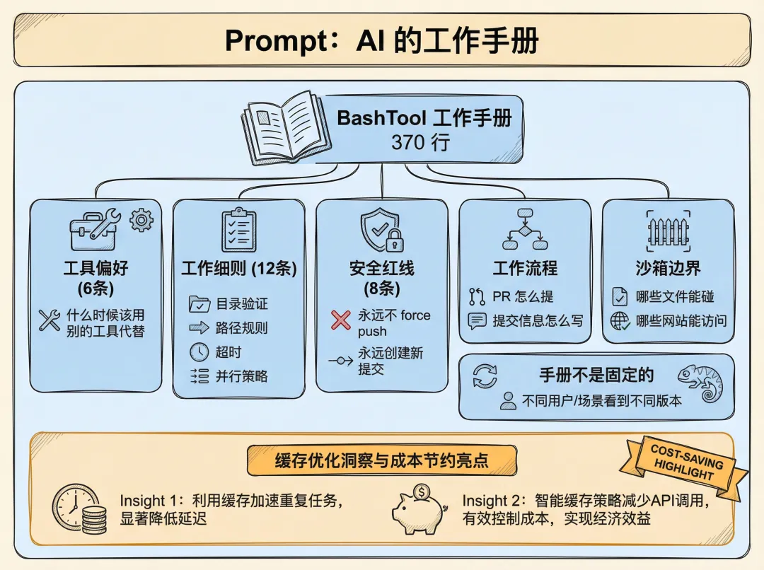Claude Code 里最复杂的一份是 BashTool 的,370 行——工具偏好、工作细则、安全红线、工作流程、沙箱边界,像一本完整的岗位说明书。